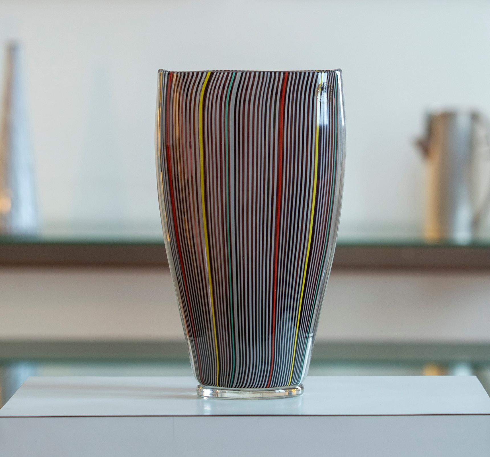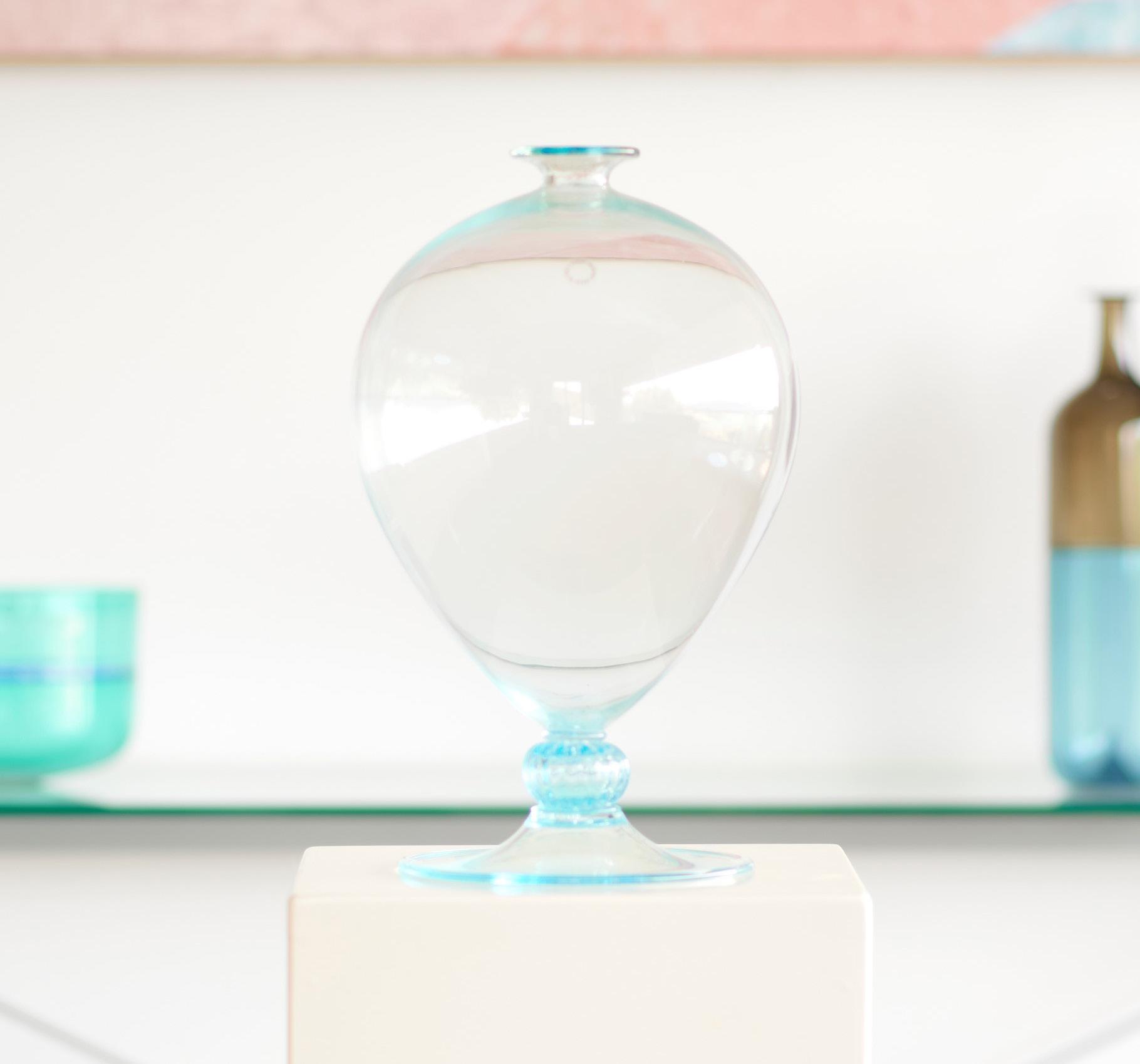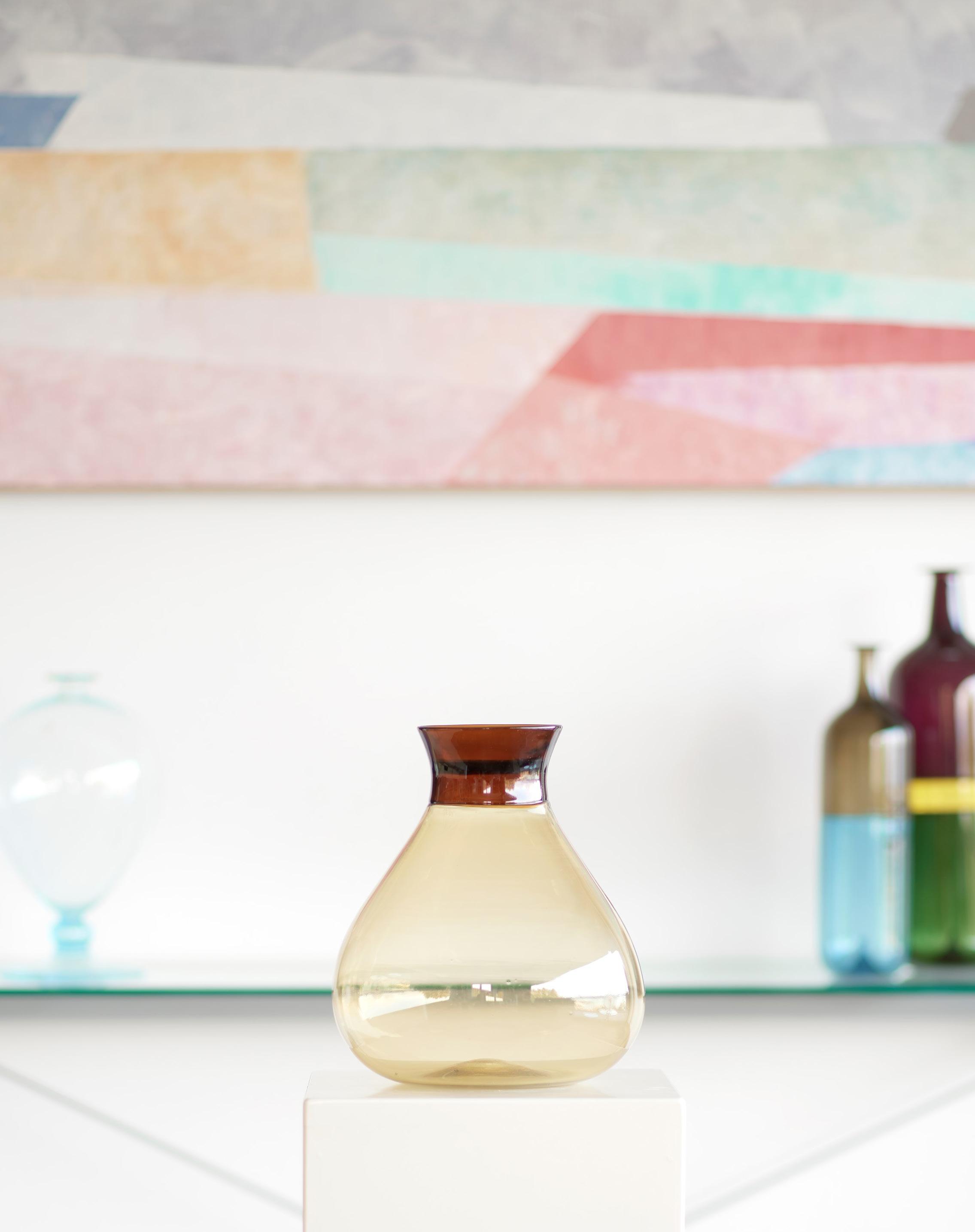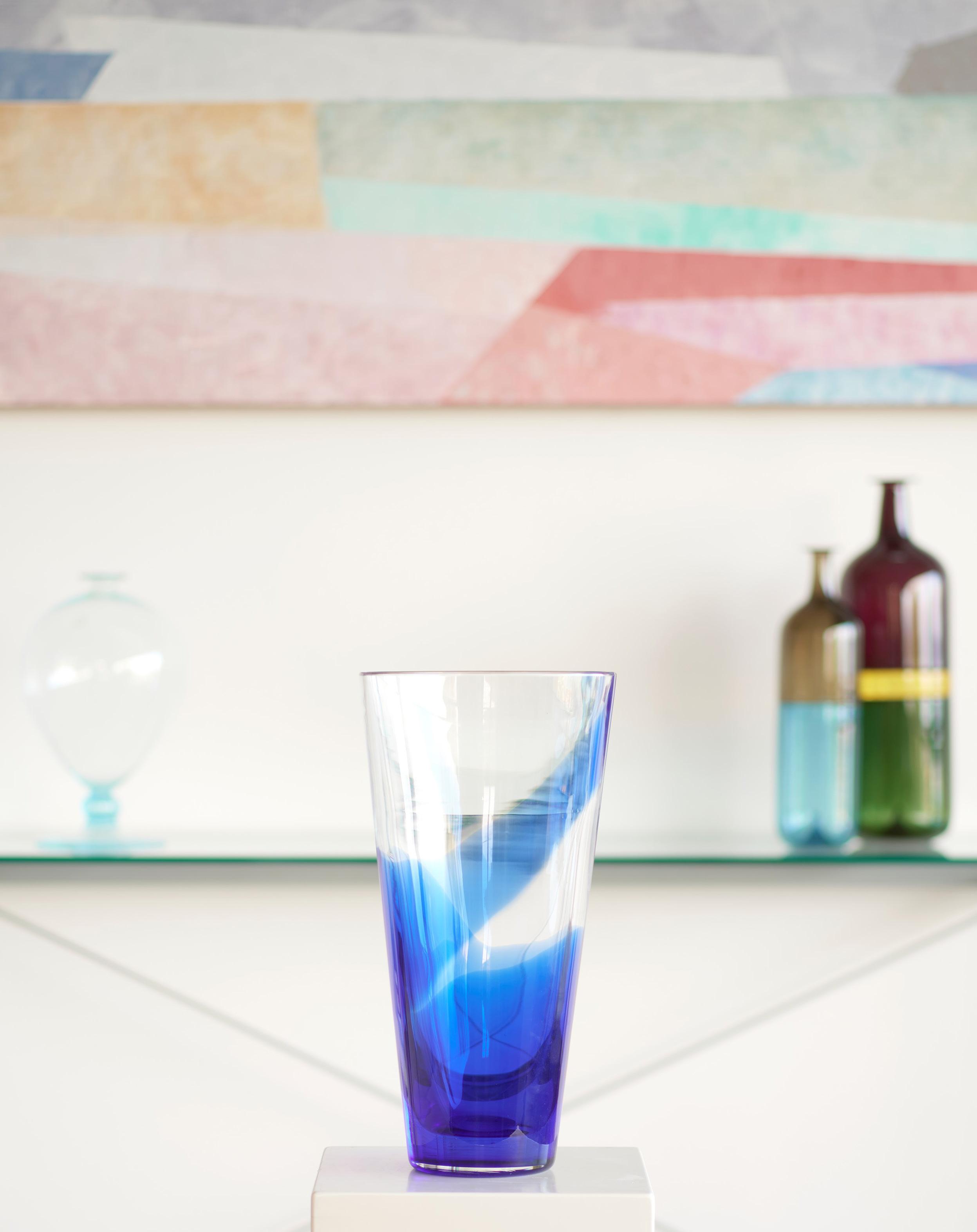 curate, con tavole imbandite e oggetti scelti con la stessa attenzione riservata alle opere. Particolare menzione meritano le cinque bottiglie della serie Bolle di Tapio Wirkkala per Venini, appoggiate sui tavolini da caffè in cristallo per esaltarne la sottile trasparenza e le sfumature – dall’ambra al verde bottiglia, dall’azzurro al rosa fumé. Gli amati servizi di piatti Richard Ginori e le tovaglie in lino dai colori accesi rimbalzavano e amplificavano le cromie geometriche delle ampie tele di Vittorio Matino, attraversate da velature parallele. Ne emergeva un’atmosfera di armonia misurata, in cui il piacere evidente di far stare bene chi entrava si faceva gesto concreto, quotidiano.