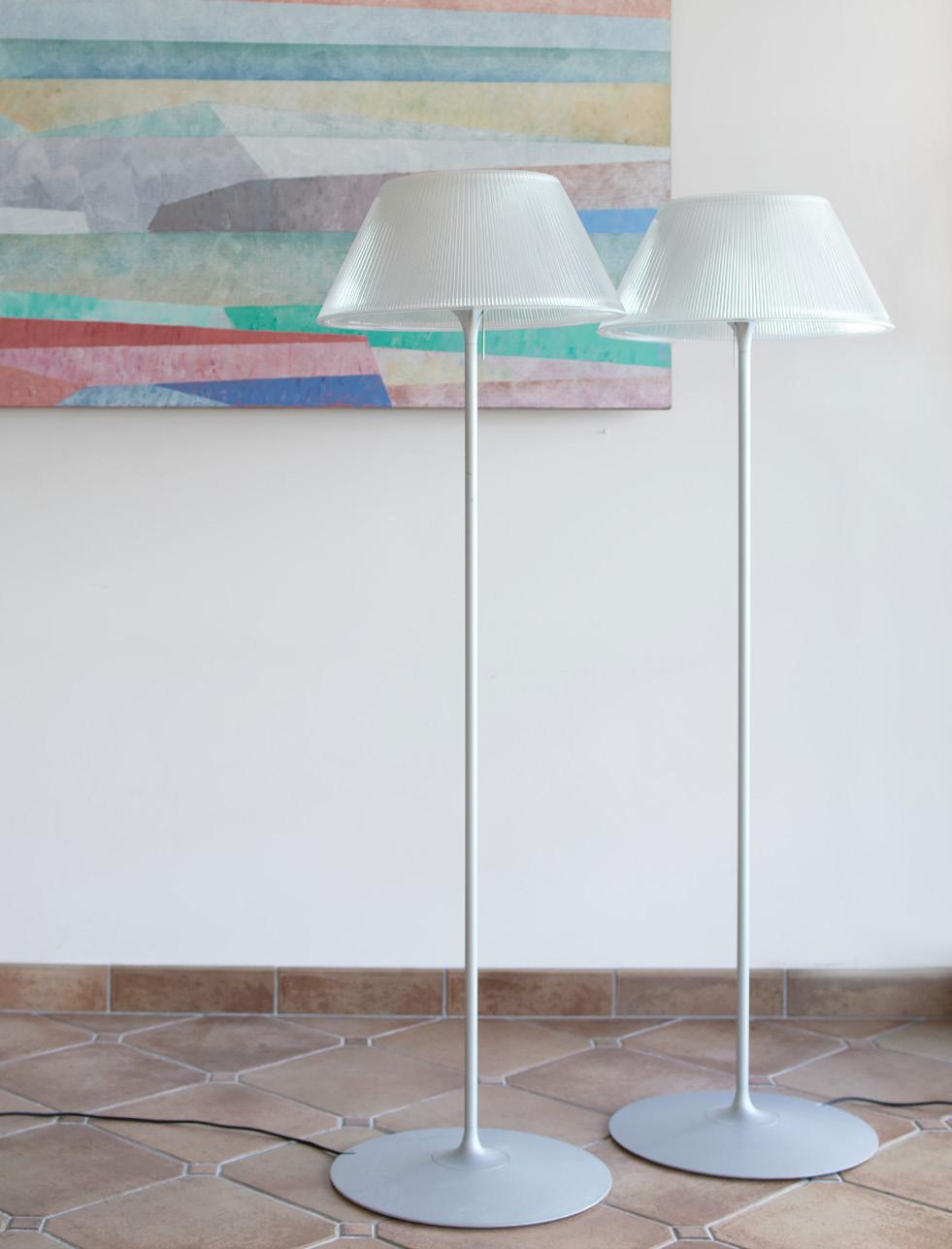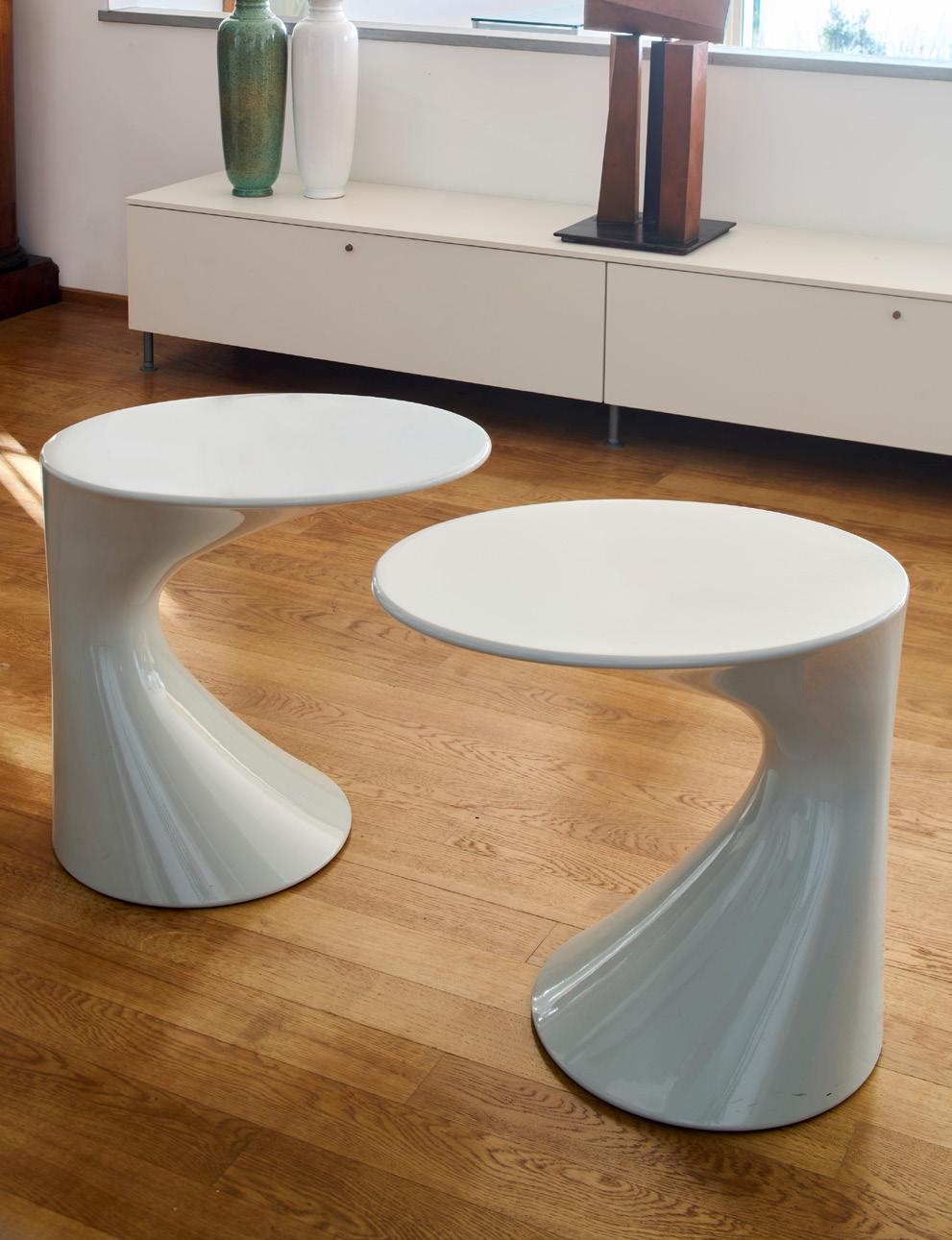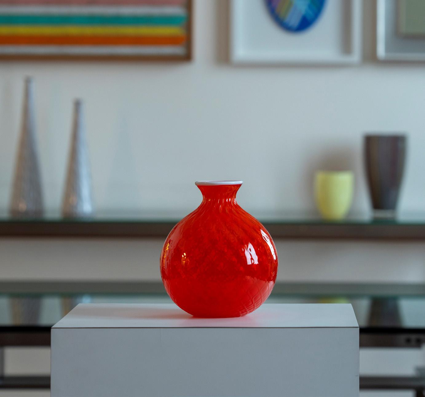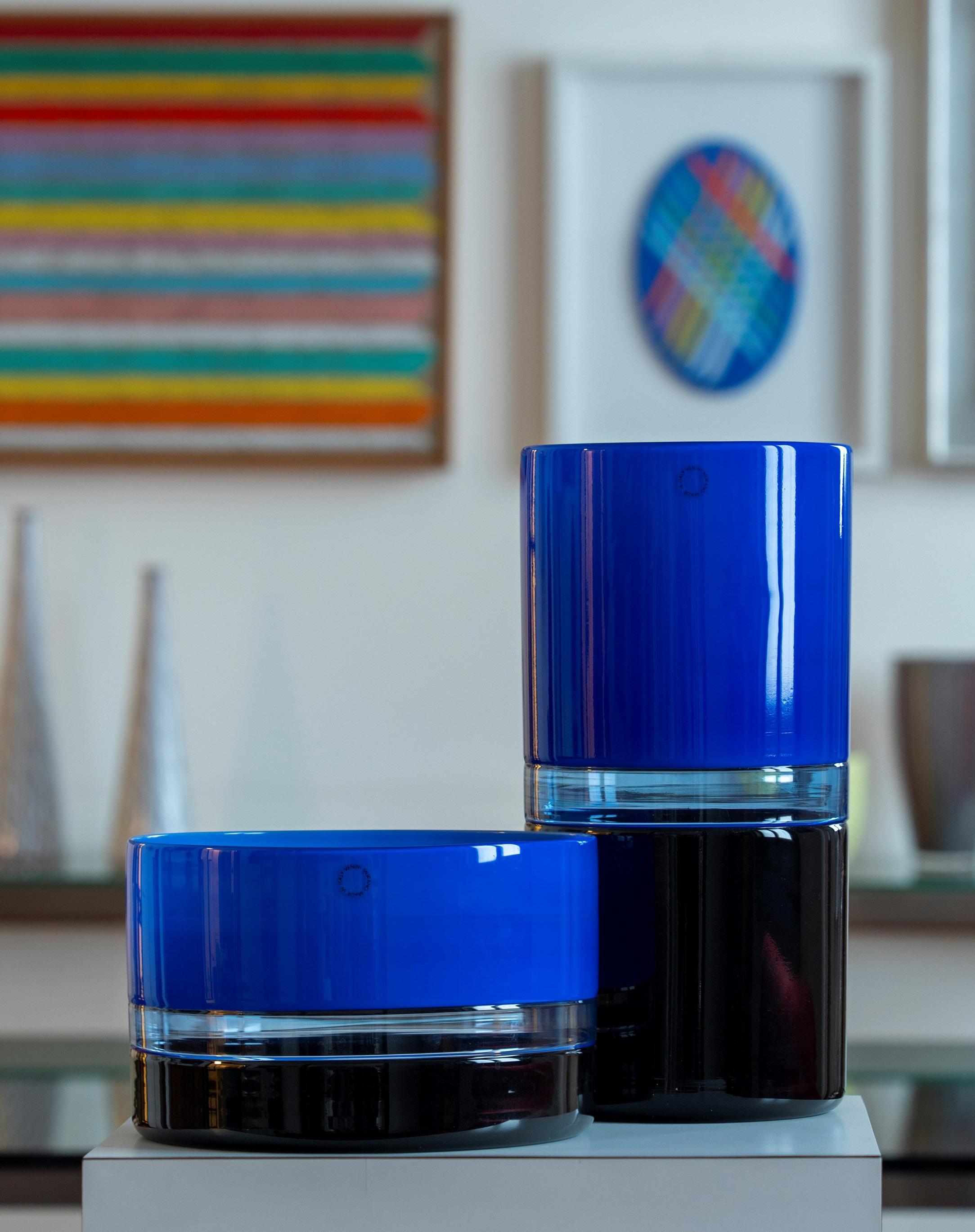 curate, con tavole imbandite e oggetti scelti con la stessa attenzione riservata alle opere. Particolare menzione meritano le cinque bottiglie della serie Bolle di Tapio Wirkkala per Venini, appoggiate sui tavolini da caffè in cristallo per esaltarne la sottile trasparenza e le sfumature – dall’ambra al verde bottiglia, dall’azzurro al rosa fumé. Gli amati servizi di piatti Richard Ginori e le tovaglie in lino dai colori accesi rimbalzavano e amplificavano le cromie geometriche delle ampie tele di Vittorio Matino, attraversate da velature parallele. Ne emergeva un’atmosfera di armonia misurata, in cui il piacere evidente di far stare bene chi entrava si faceva gesto concreto, quotidiano.