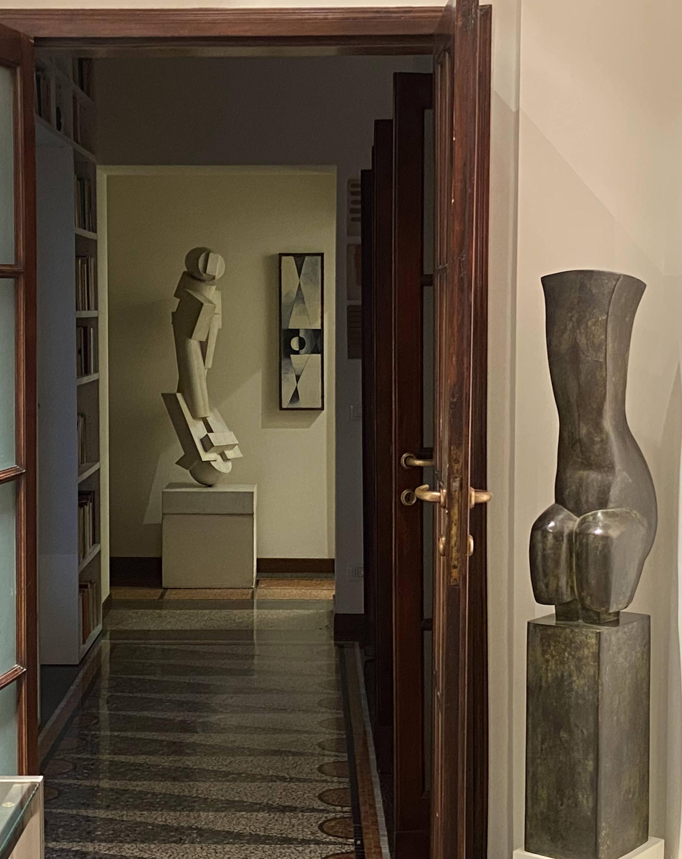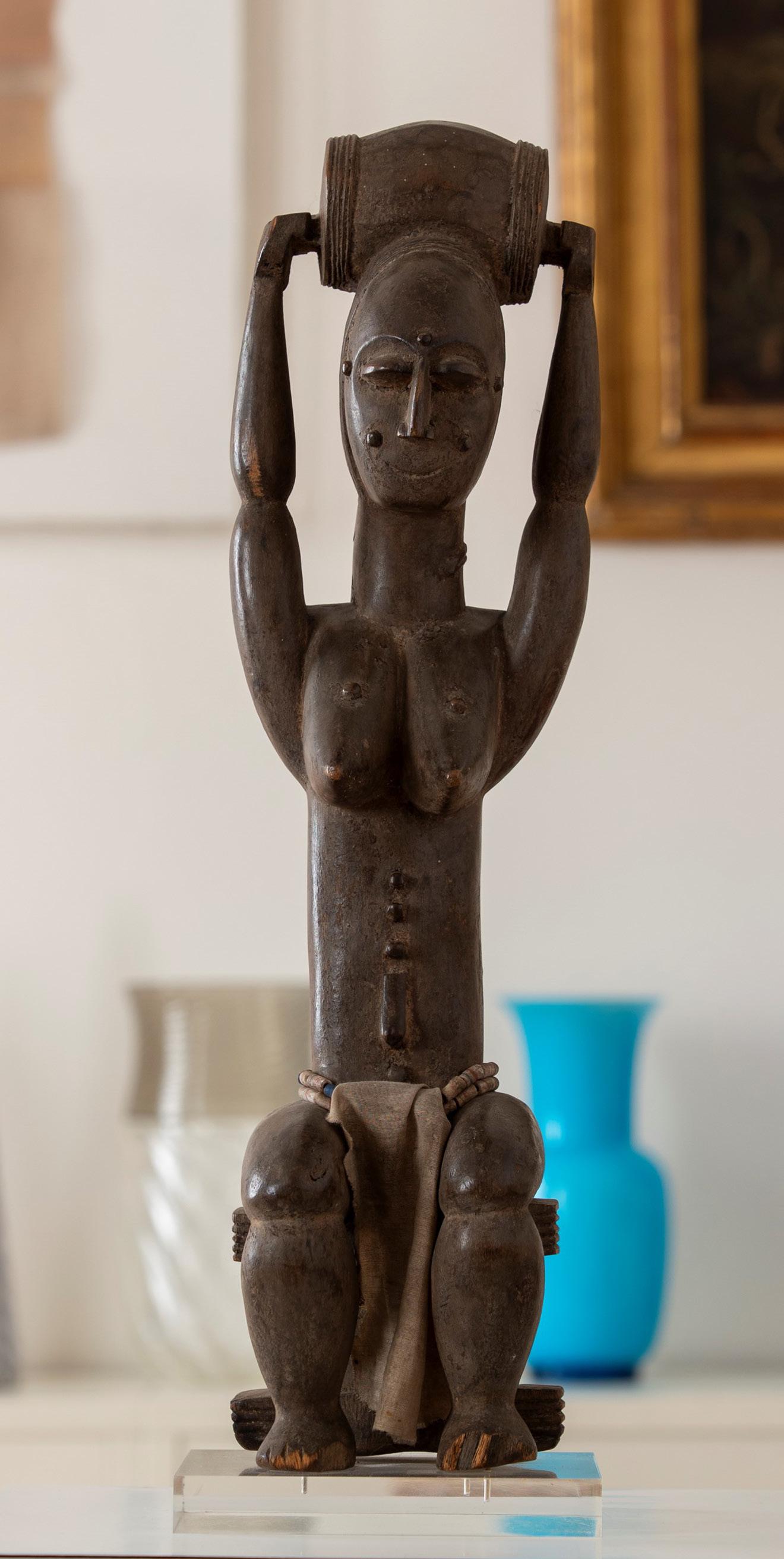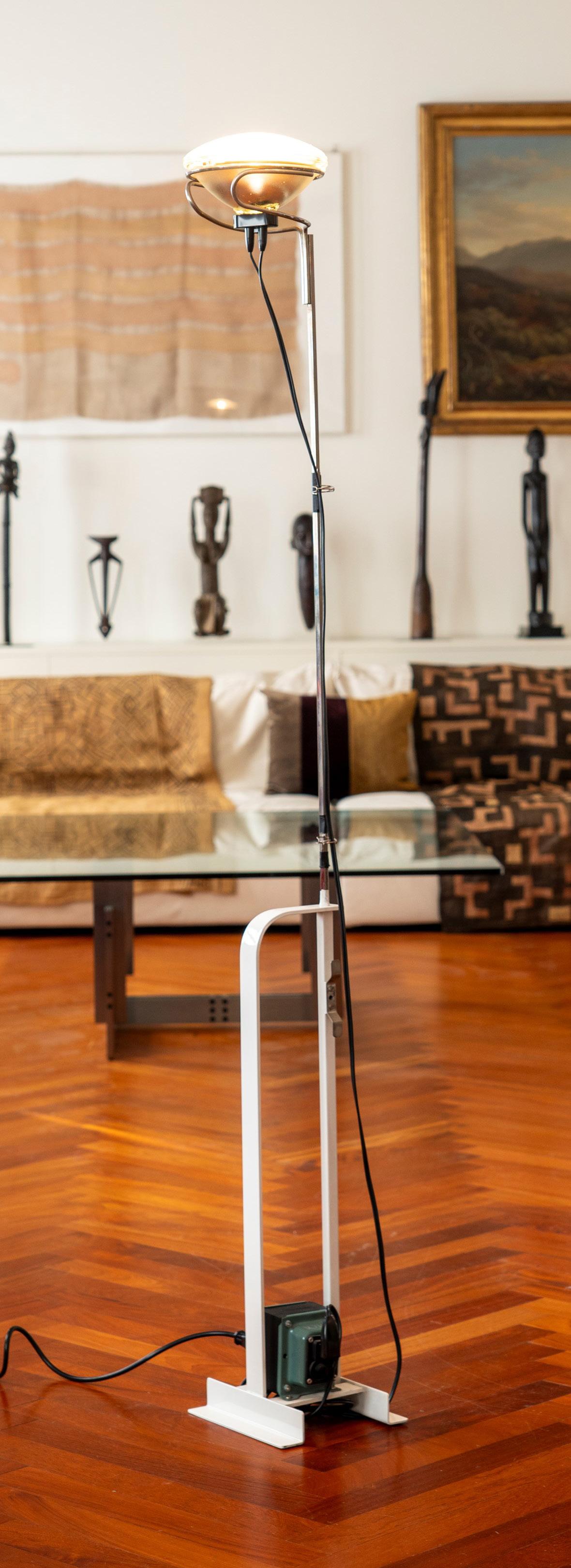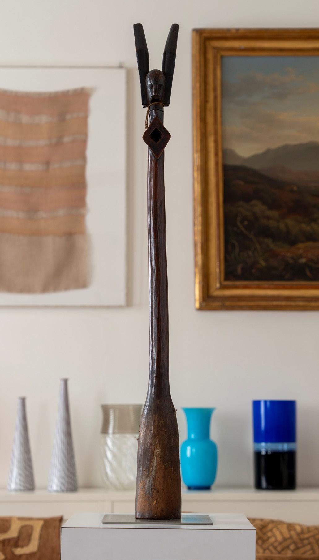 All’ingresso, la scultura in bronzo patinato di Mario Negri “Erma”, acquistata anni prima, veniva posta come un totem all’entrata, non a caso a segnare una soglia – simbolo di protezione e di confine, punto di passaggio tra il mondo esterno e lo spazio della casa. Una grande scultura lignea della Costa d’Avorio, il Calao, – uccello mitico legato alla fertilità, alla conoscenza e al legame fra cielo e terra – era posta dietro la porta d’entrata, quasi a custodire la dimensione più intima e raccolta della vita domestica, racchiusa negli ampi spazi del doppio salone. A completare questo percorso nell’architettura simbolica delle soglie, la struttura di supporto del tetto di una Toguna, l’edificio pubblico caratteristico della cultura Dogon del Mali, si stagliava come ulteriore emblema di accoglienza e protezione.