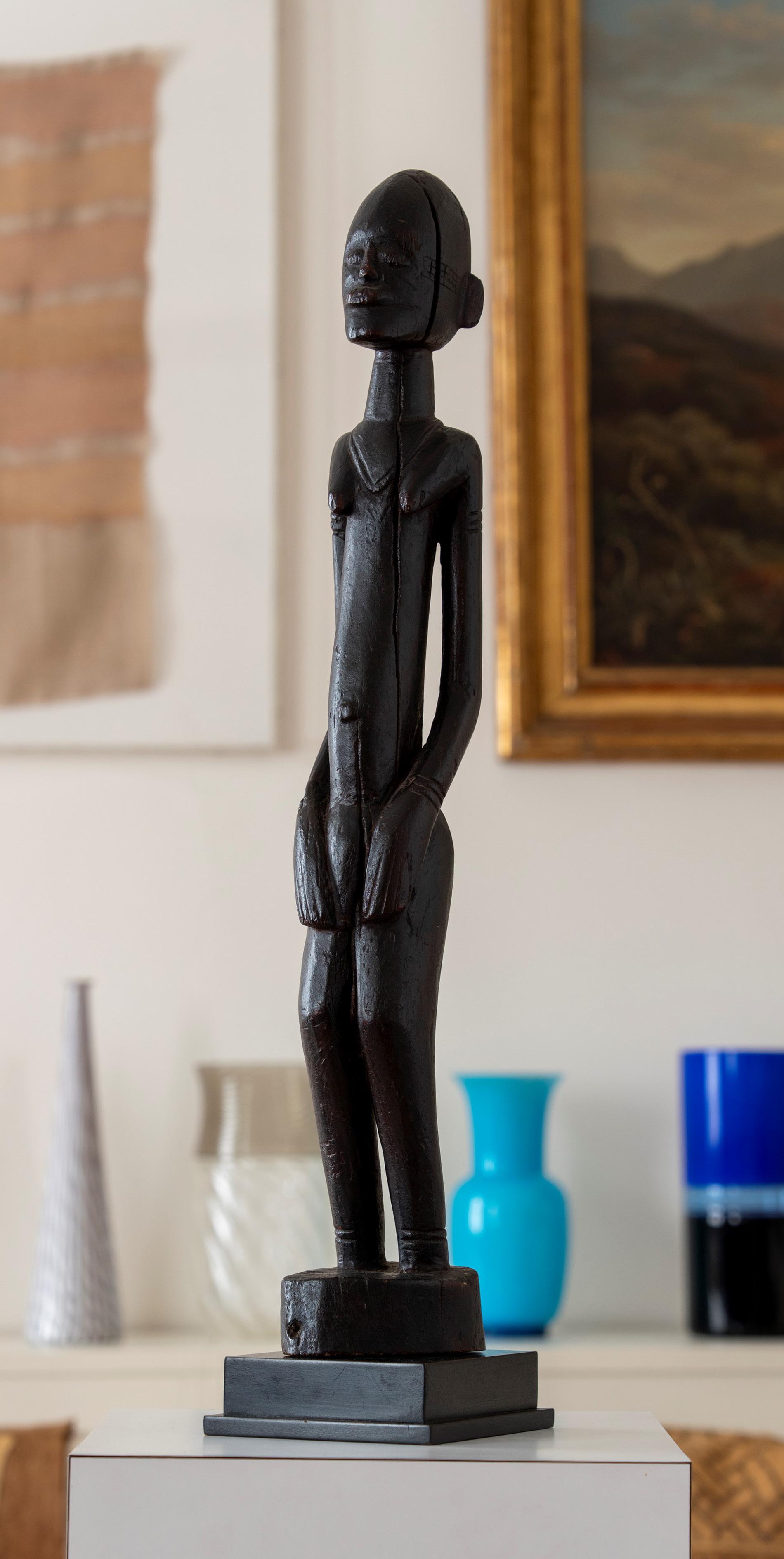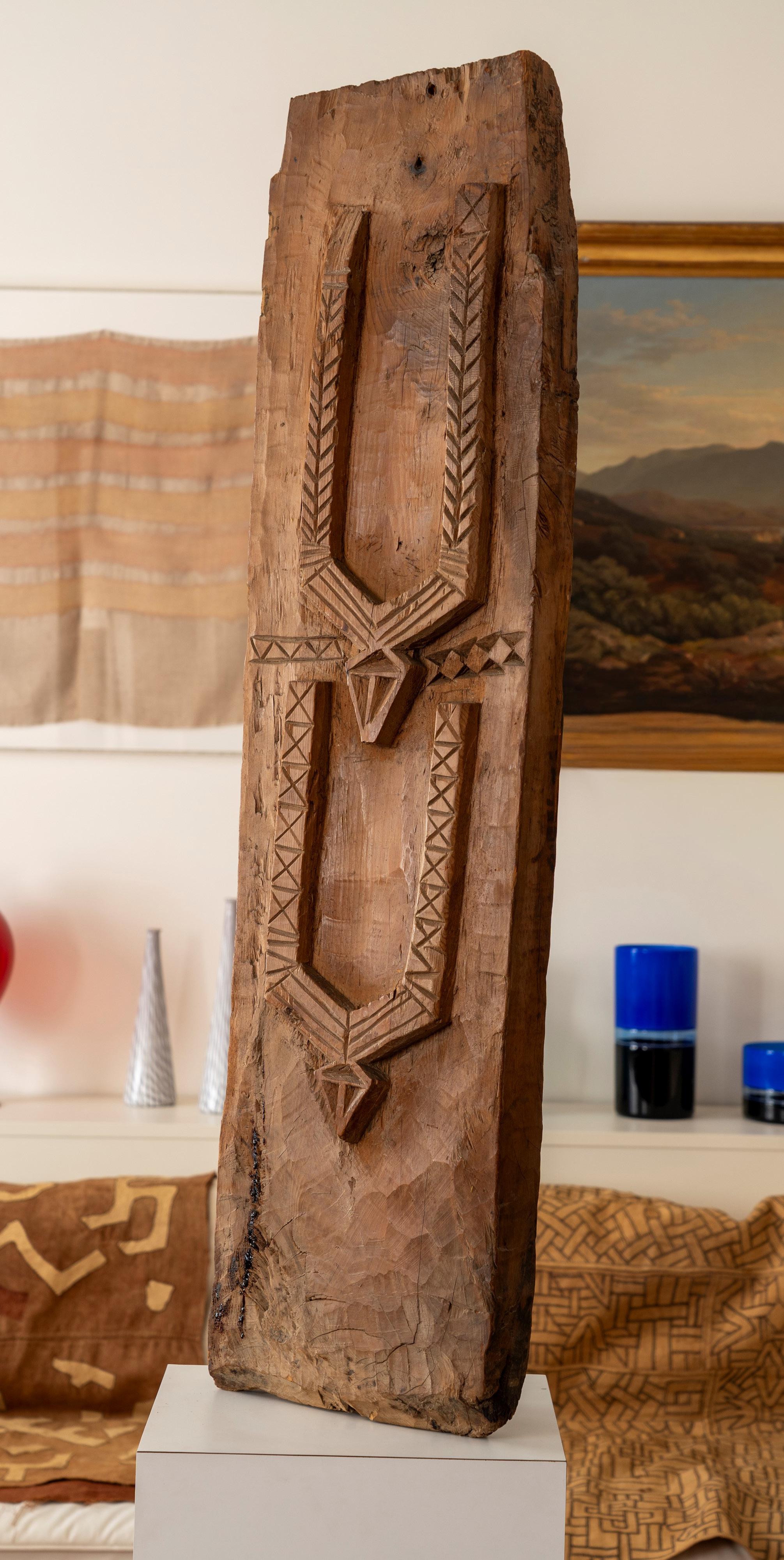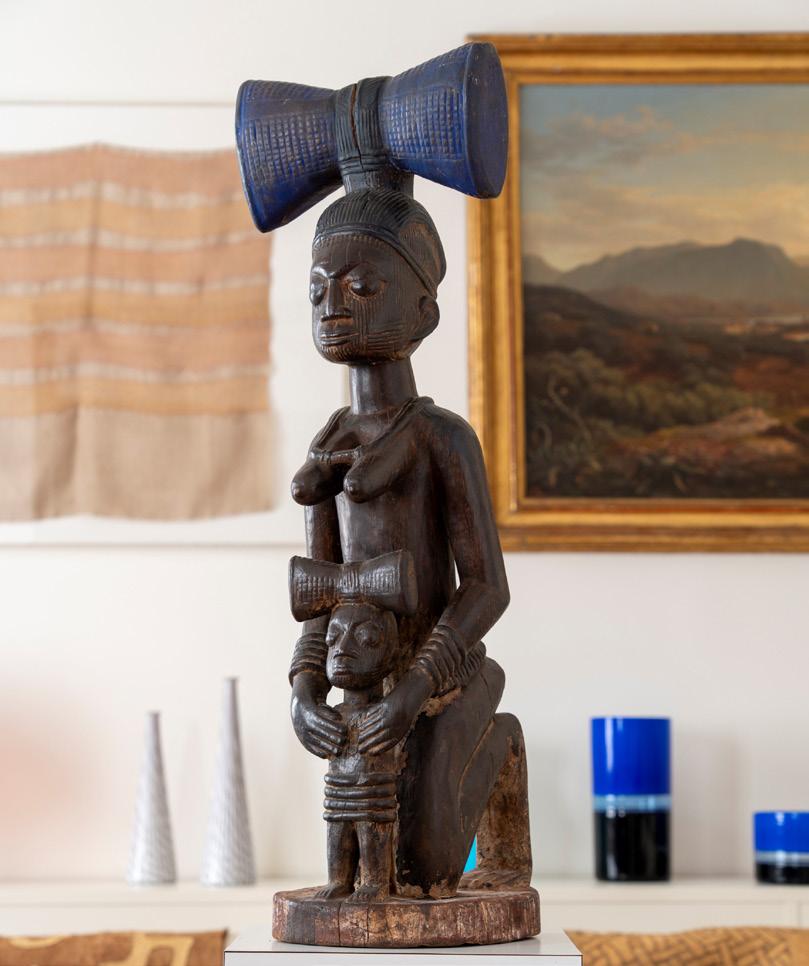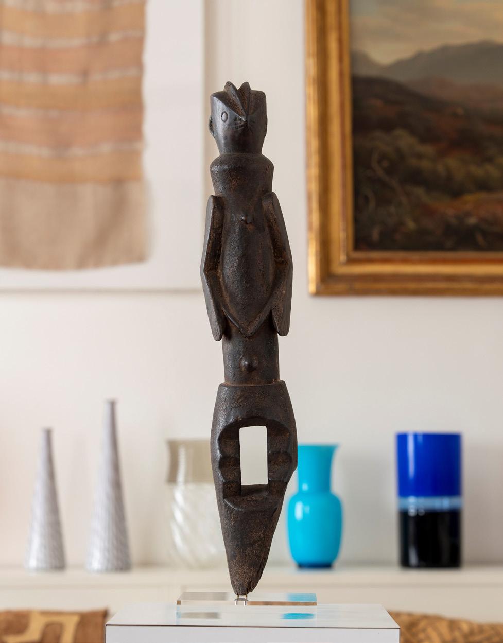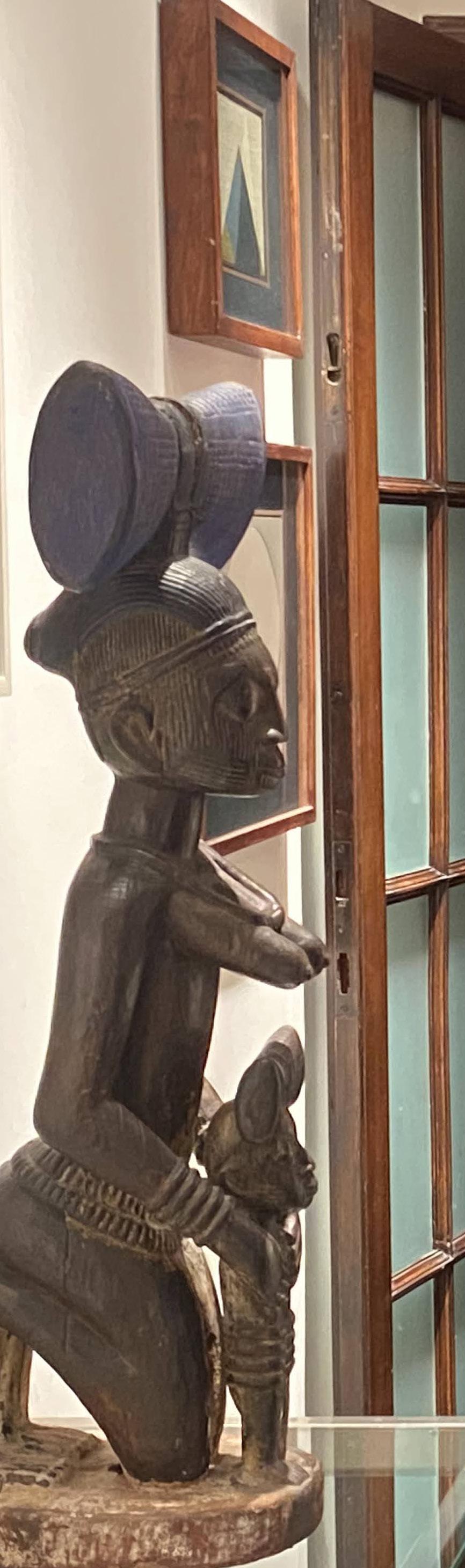 All’ingresso, la scultura in bronzo patinato di Mario Negri “Erma”, acquistata anni prima, veniva posta come un totem all’entrata, non a caso a segnare una soglia – simbolo di protezione e di confine, punto di passaggio tra il mondo esterno e lo spazio della casa. Una grande scultura lignea della Costa d’Avorio, il Calao, – uccello mitico legato alla fertilità, alla conoscenza e al legame fra cielo e terra – era posta dietro la porta d’entrata, quasi a custodire la dimensione più intima e raccolta della vita domestica, racchiusa negli ampi spazi del doppio salone. A completare questo percorso nell’architettura simbolica delle soglie, la struttura di supporto del tetto di una Toguna, l’edificio pubblico caratteristico della cultura Dogon del Mali, si stagliava come ulteriore emblema di accoglienza e protezione.