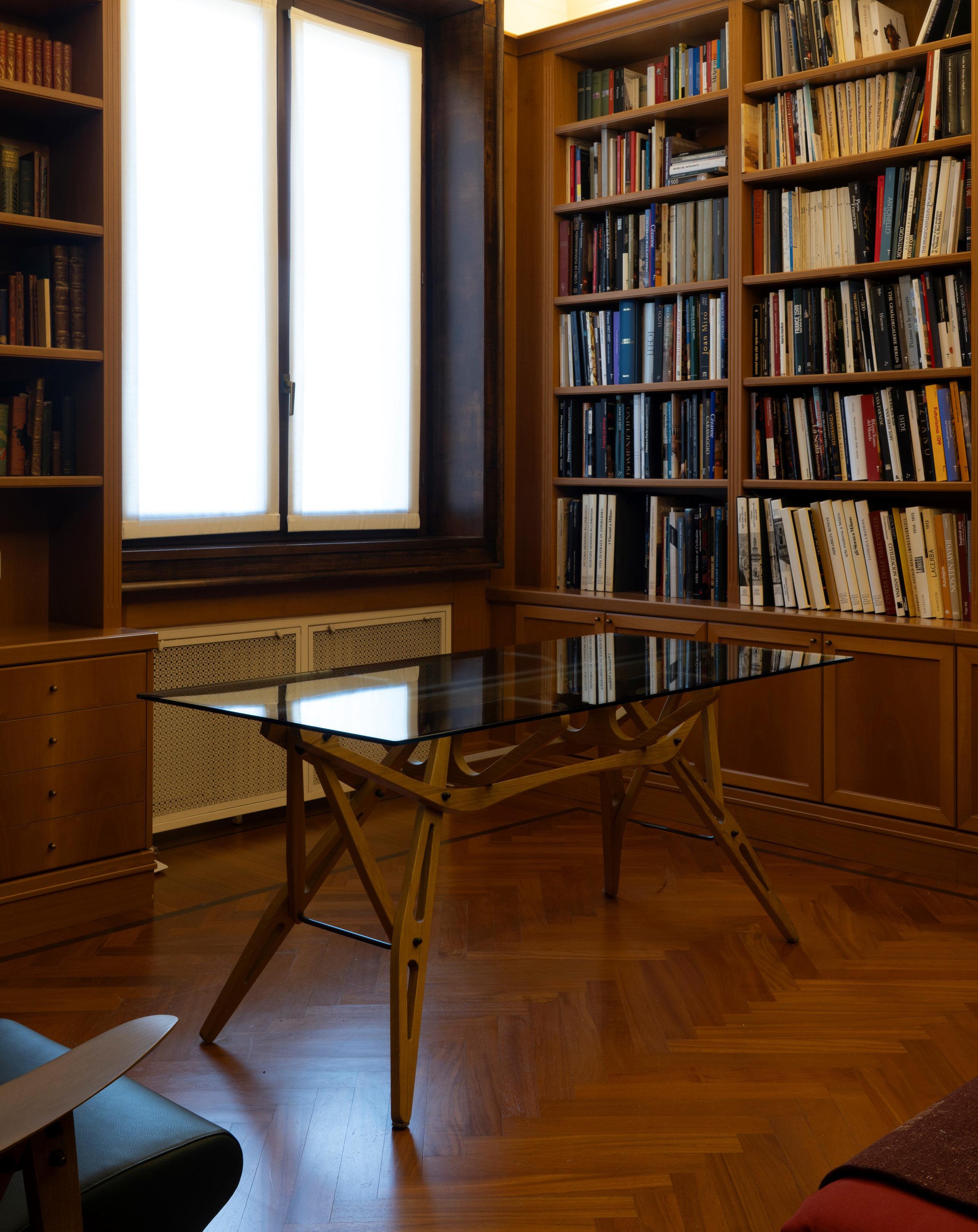 Entrando oggi nelle sue case, quelle scene sembrano affiorare ovunque. La scrivania non è soltanto un mobile: è un punto magnetico. Tutto intorno, scaffali ricolmi di volumi che spaziano dai trattati di arbitrato internazionale ai cataloghi e alle retrospettive di arte e design, fino ai libri di luoghi e culture lontane: libri vissuti, consultati, regalati. Gli spazi in salotto e nella sala da pranzo contano ampie sedute, tavoli lunghi fatti per vestire tovaglie imbandite.