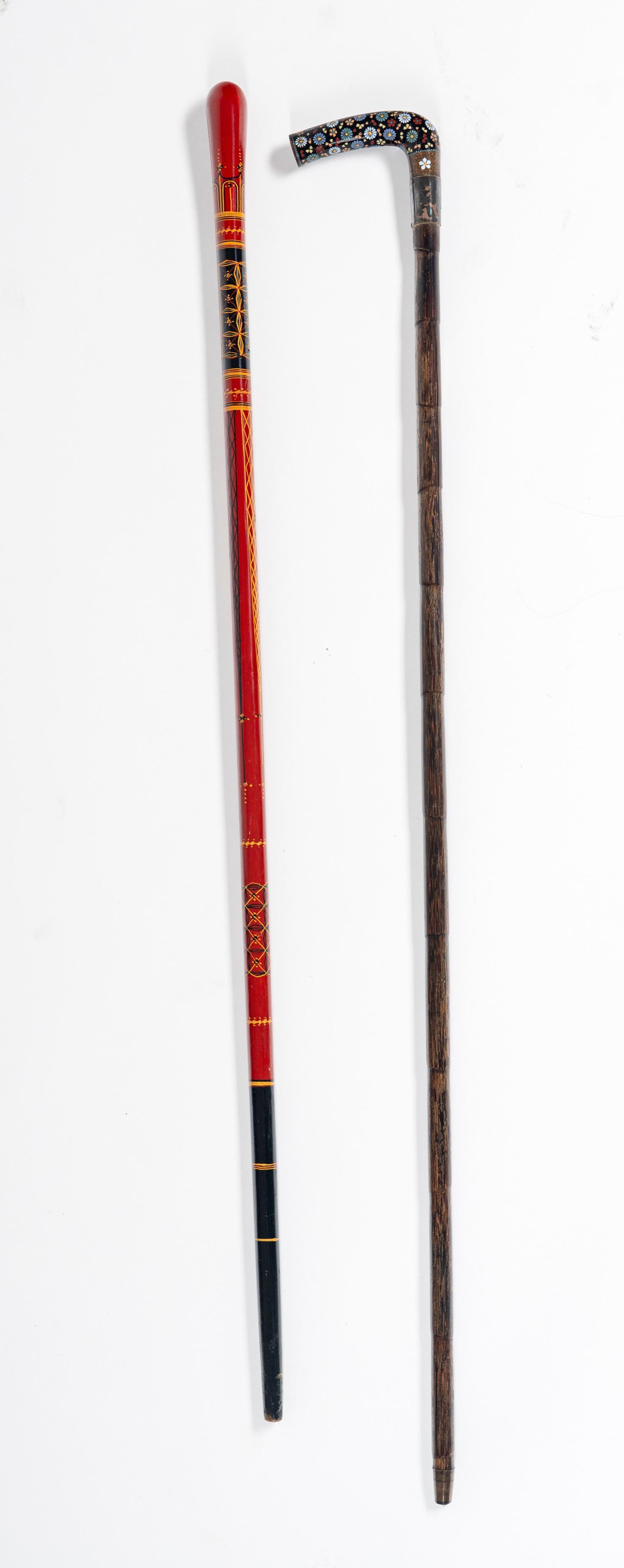 Uno francese, in legno con presa cloisonnè in smalto su rame a motivi di fiorellini policromi. L’altro russo in legno laccato su fondo bordeaux con fasce nere decorate in oro, impugnatura a pomolo.