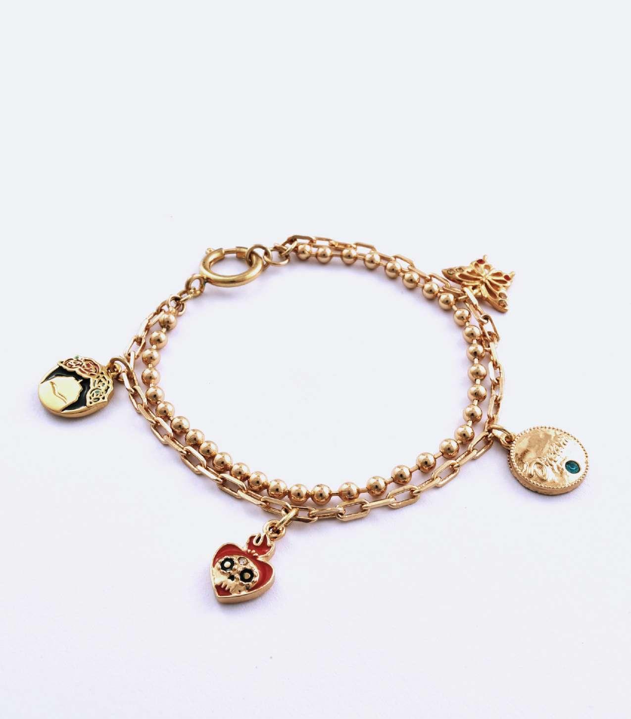 Pulsera con doble cadena y dijes inspirados en México y su festividad de día de muertos con detalles de cristal y pintura a mano.