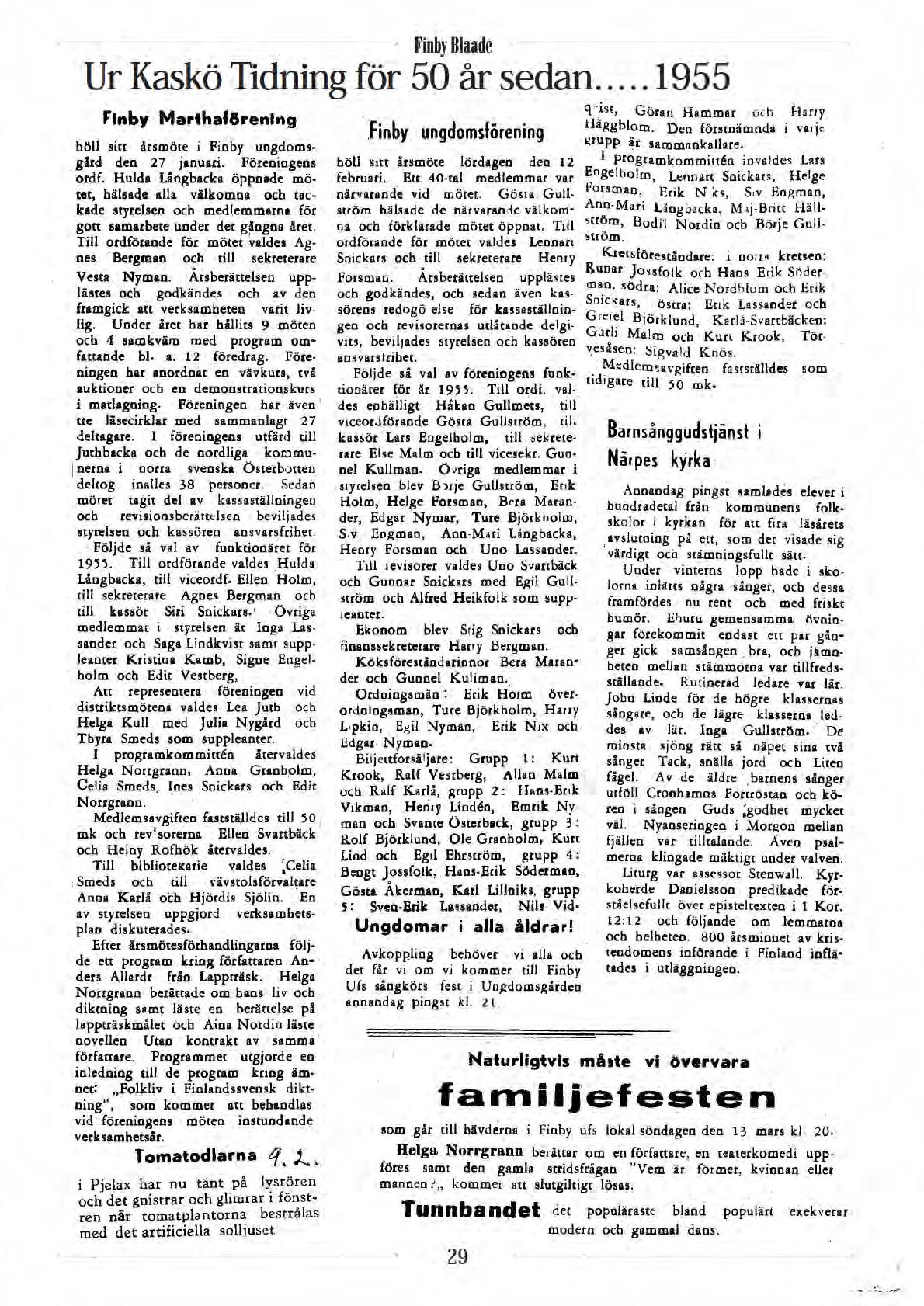 Som ordförande i föreningen har fungerat bland andra Arne Kangas 1955-59, Gustav Kangas 196971, Kaj Hagman 1972-73, Håkan Grönvik 1975-76, K J Nordlund 1977-78, Pehr Nisuls 1979-81, Rainer Mickels 1982-86 och 1989-90, Erling Erickson 198788, Gunvor Ivars 1991-94, Christer Ahlholm 199596 och 1998 samt Carita Asplund 2001-04. Nuvarande ordförande är Christian Andersson. Arne Kangas var sekreterare 1945-46, Gustav Kangas 1969-72, Else-Maj Skrifvars 1973-81 och 2001-04, Raymond Wesander 1982-84, Iris Vihermaa 1993 och Gunvor Ivars 1996.