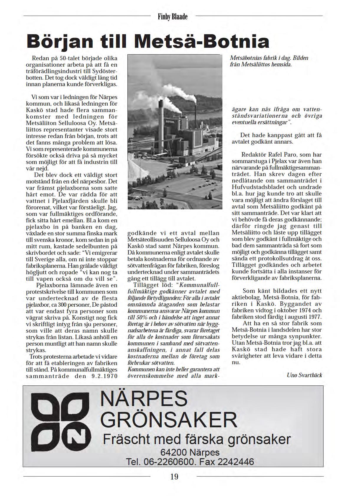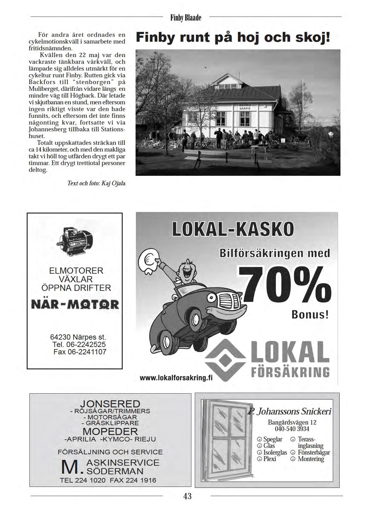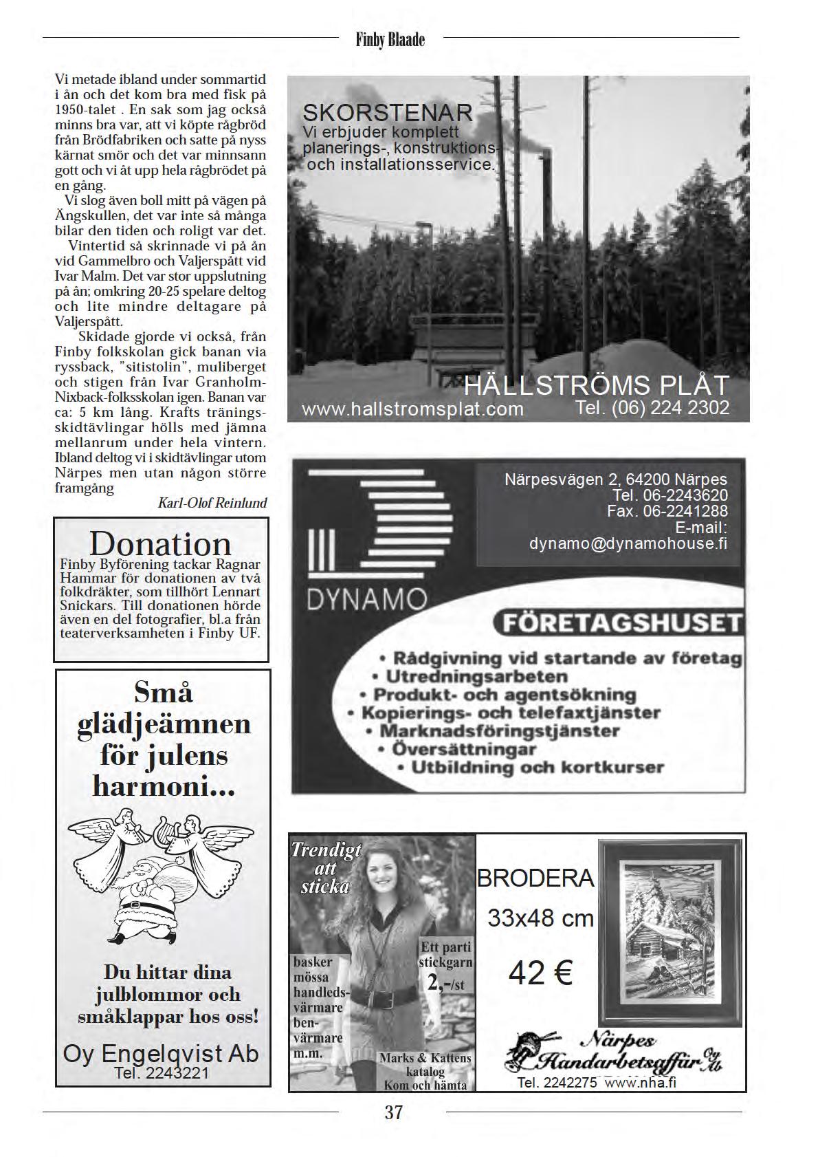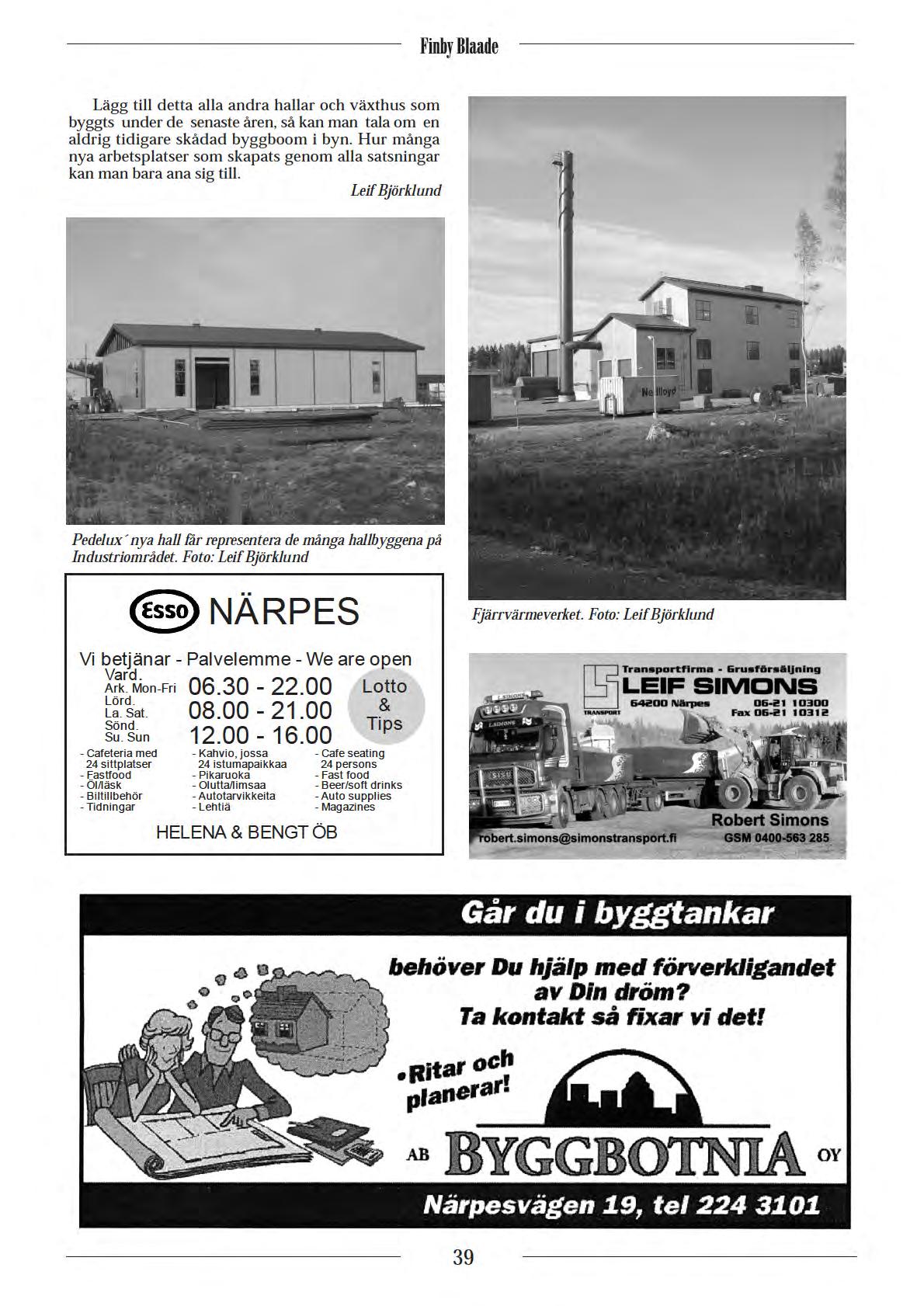 Ett omfattande arbete sattes ner på byhhistoriken Finbyboken - en by i Närpes. Den blev på hela 616 sidor utkom 16.12 1989 i 1.200 ex. FinbyBlaadeharsedanstarten1985årligen tryckts i en upplaga om 500-600 exemplar