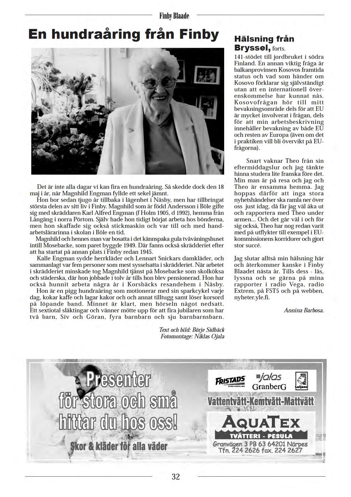 Årets Finbyungdom, Sabina Berg, uppvaktades med det traditionella presentkortet och blommor. Sabina är en aktiv tjej som håller på med fotboll, friidrott och showdans.