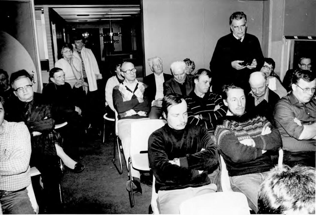 Byarådet bildas vid ett möte i Finby 15.11 1983. Uno Svartbäck gör ett uttalande. Till vänster om honom bl a Arne Bergman, Einar Widqvist, Rune Holmström och Torsten Wesander. I första raden fr h Sven Backman och Rainer Forsman. - Foto: B Sidbäck