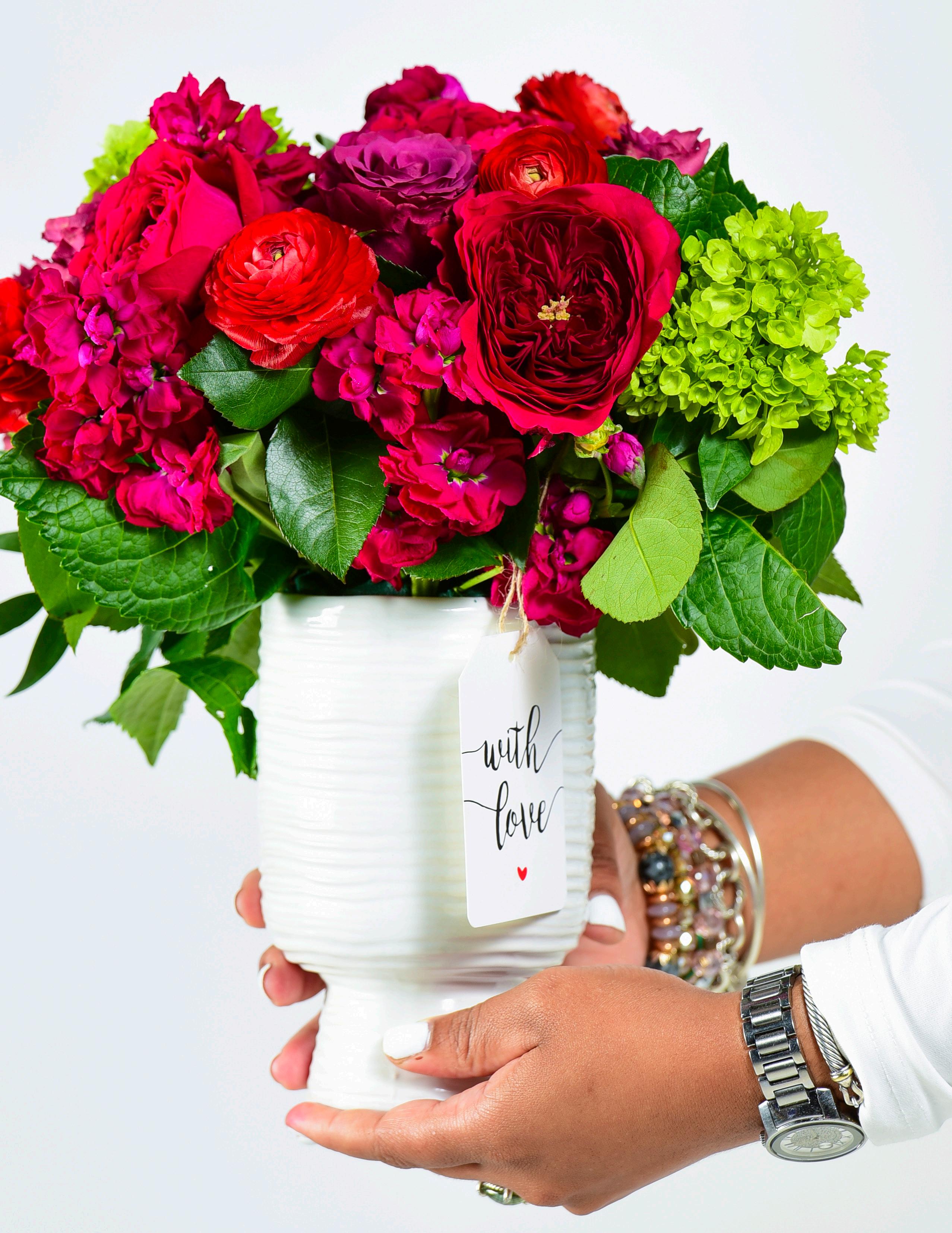 This classic hand-tied bouquet comes in four sizes (Cutie, Standard, Premium and Luxe) making it perfect for any affair. This mix of reds, greens, pinks and purples makes this bouquet truly one of a kind.