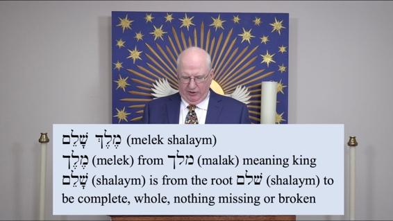 His second title was MElDv JKRlRm (melek shalaym). KRlRm (melek), of course, is the same root as the yI;kVlAm (malki), it means king. And then MElDv (shalaym) is from the root Mlv (shalaym), which means complete, whole, nothing missing, nothing broken. Translated here as peace. And so Melchizedek was the King of Peace, title number two.