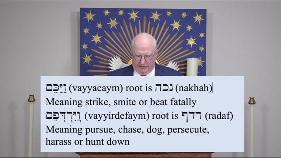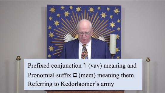 And this phrase is composed of those two words, each which has a prefixed conjunction meaning and, and the suffix, pronominal suffix, which means them. The them is referring to the Kedorlaomer's army. So what did they do to them? The first word has the root hkn (nakhah). It means strike, smite, or beat fatally. So this is the part of the phrase where they attacked and routed. They literally put them to the sword and killed them. So they destroyed, I think, the majority of the army, causing them to turn tail and run. And that brings up the second word, and the root of the second word is Pdr (radaf), which means pursue, chase, dog, persecute, harass, or hunt down. I like that one, hunt down.