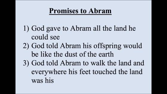 The only other thing I want to bring out is that after those two separated, Abram was shown by Elohim multiple promises. He said, now look to the north, the south, the east, and the west. Everything you see is yours. And I want you to walk the length and breadth of the land. Everywhere your foot steps is yours. He was giving Canaan to Abram.