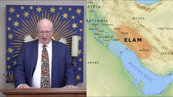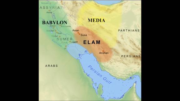 I'm going to put up a graphic here really quick so you can see where Elam is. We've talked about Elam in the past. It was a buffer territory between Babylon, you can see Elam there in the orange, and Persia is on the other side, Parthians, the Medes. So it was a buffer between Babylon and those nations to the east.