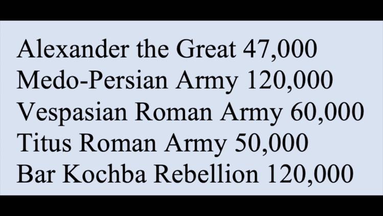 For example, Alexander the Great conquered the world with an army of 47,000. The Persians tried to invade Greece with an army of 120,000. When the Romans conquered Judea, they were bringing in armies on the order of 50,000 to 60,000. For example, Vespasian invaded the majority of Judea, except for Jerusalem with an army of 60,000. His son Titus then came in and finished the job with an army of 50,000 when they laid siege to Jerusalem. And then the biggest was the 12 legions showed up for the Bar Kokhba revolt in like 137 A.D. So, I think the army size would have probably been probably in the 50s, maybe a little bit bigger than that. The Sefer HaYashar say that the army was 800,000. I think this is a little bit on the high side. I mean, the logistics of moving 800,000 men from Mesopotamia down to Canaan would have been quite difficult. Now, having said that, the standing army for Israel under King David, if you remember in the Book of Chronicles where David was incited to count his fighting men, they came up with over one and a half million fighting men. And that wasn't even including the men of Benjamin or Levi.