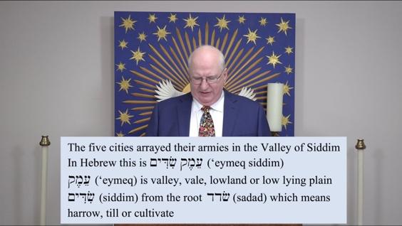 And they all were gathering for battle in the Valley of Siddim. Now the Valley of Siddim, in the Hebrew, the word translated valley is qRmEo (‘eymeq). And it can be translated as a deep valley, a vale, which would be an upper valley between peaks. Or it could be a lowlying plain or just plain, swampy lowlands. I think it was probably a low-lying plain. It was a part of the Jordan Plain where there were hills on either side. The word Myî;dIc (siddim) is a proper word and the name of the valley. But it comes from the root ddc (sadad), which means harrow, till, or cultivate. So I think this means cultivated fields. It's the valley of the cultivated fields.