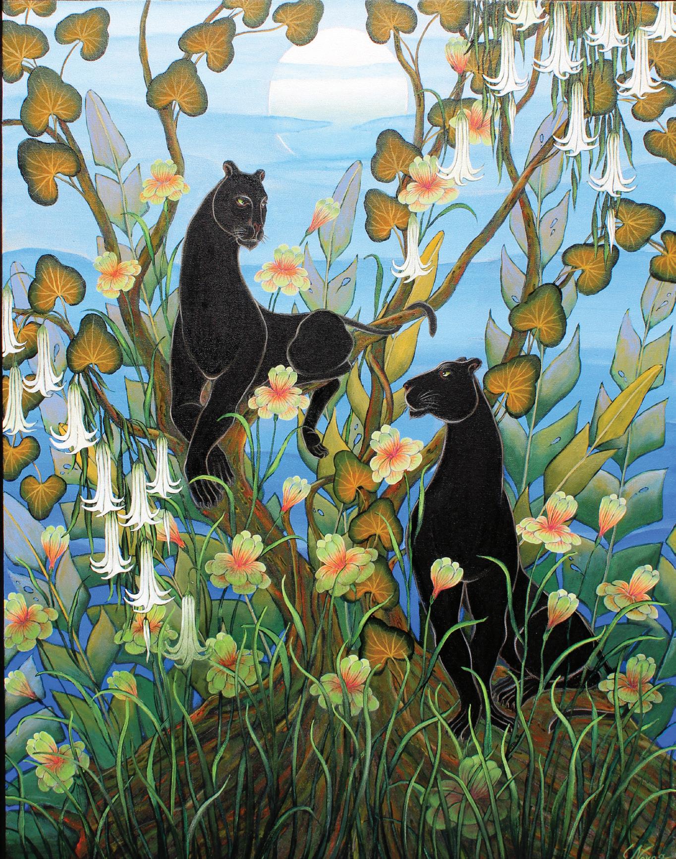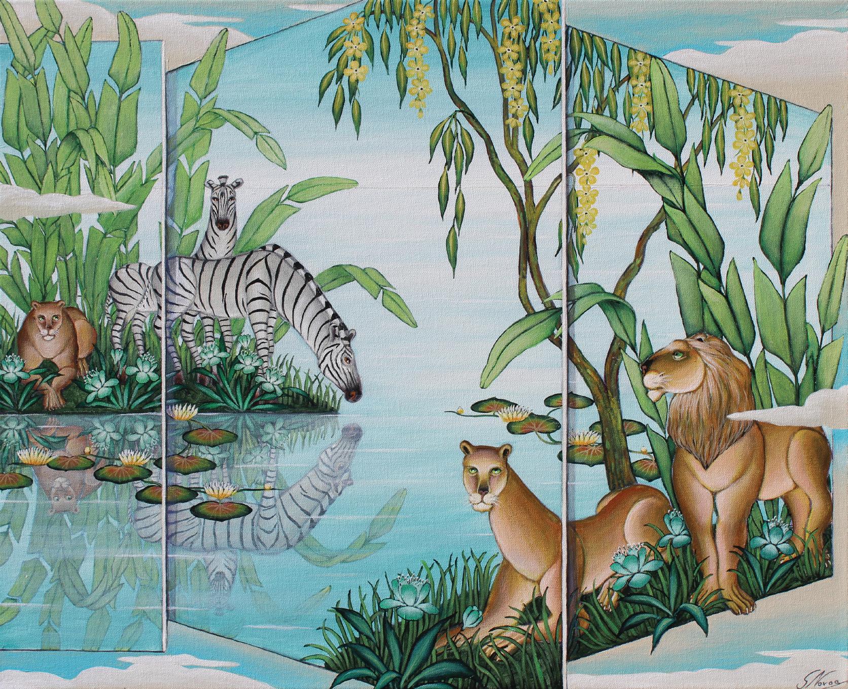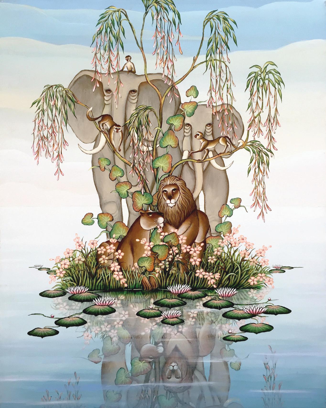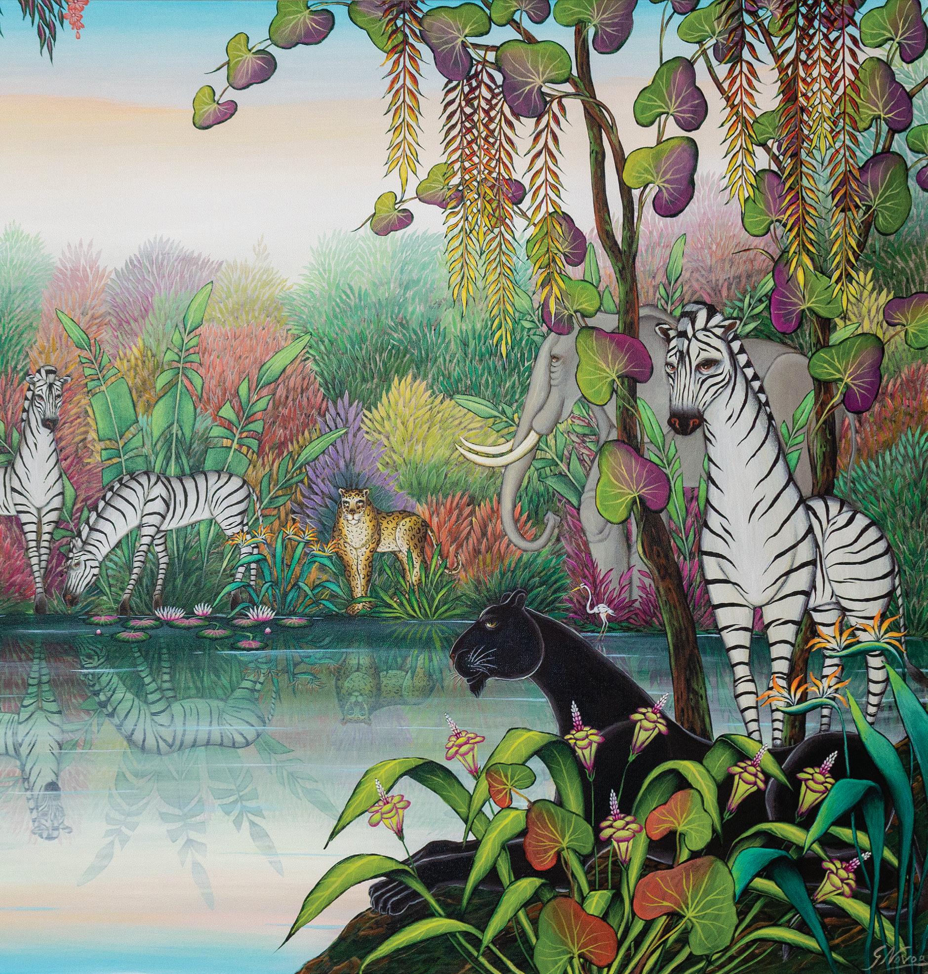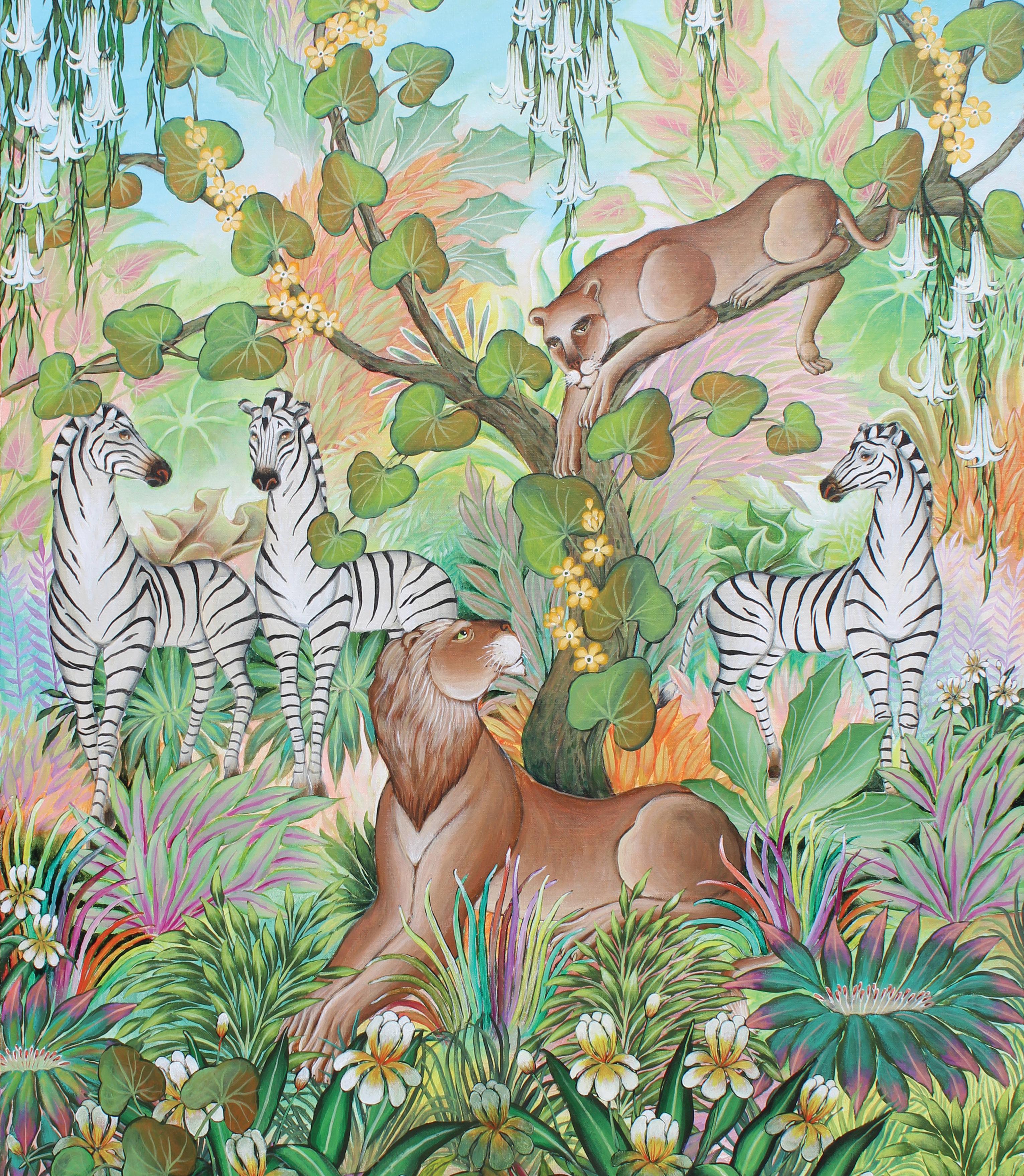 With this premise in mind, Novoa constructed a dream-like new jungle where the lion lies down with the zebra. Panthers and pandas share the shade with African monkeys and American raccoons. The radiant colors of Novoa’s luxuriant foliage seem to wield a mystical power of bringing together predator and prey, the meek and the strong.
