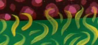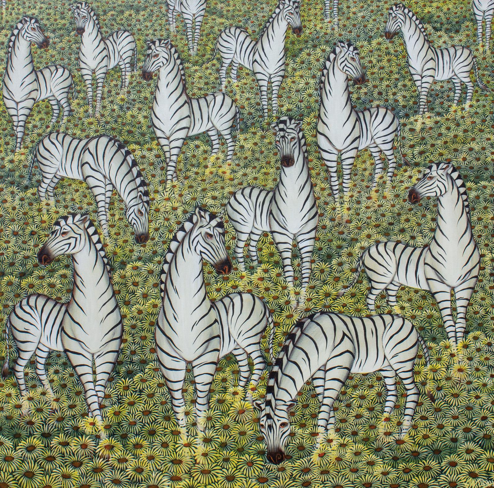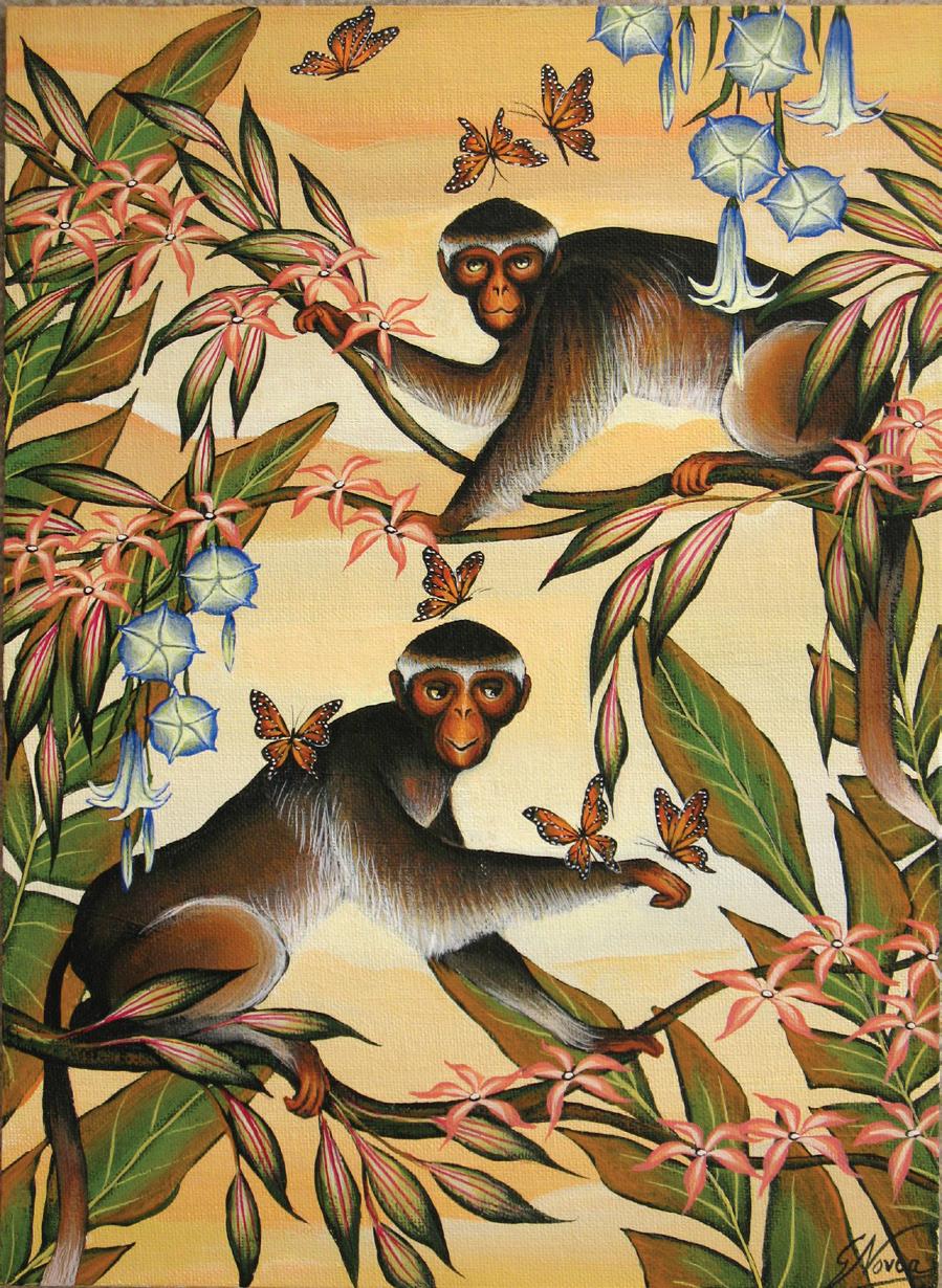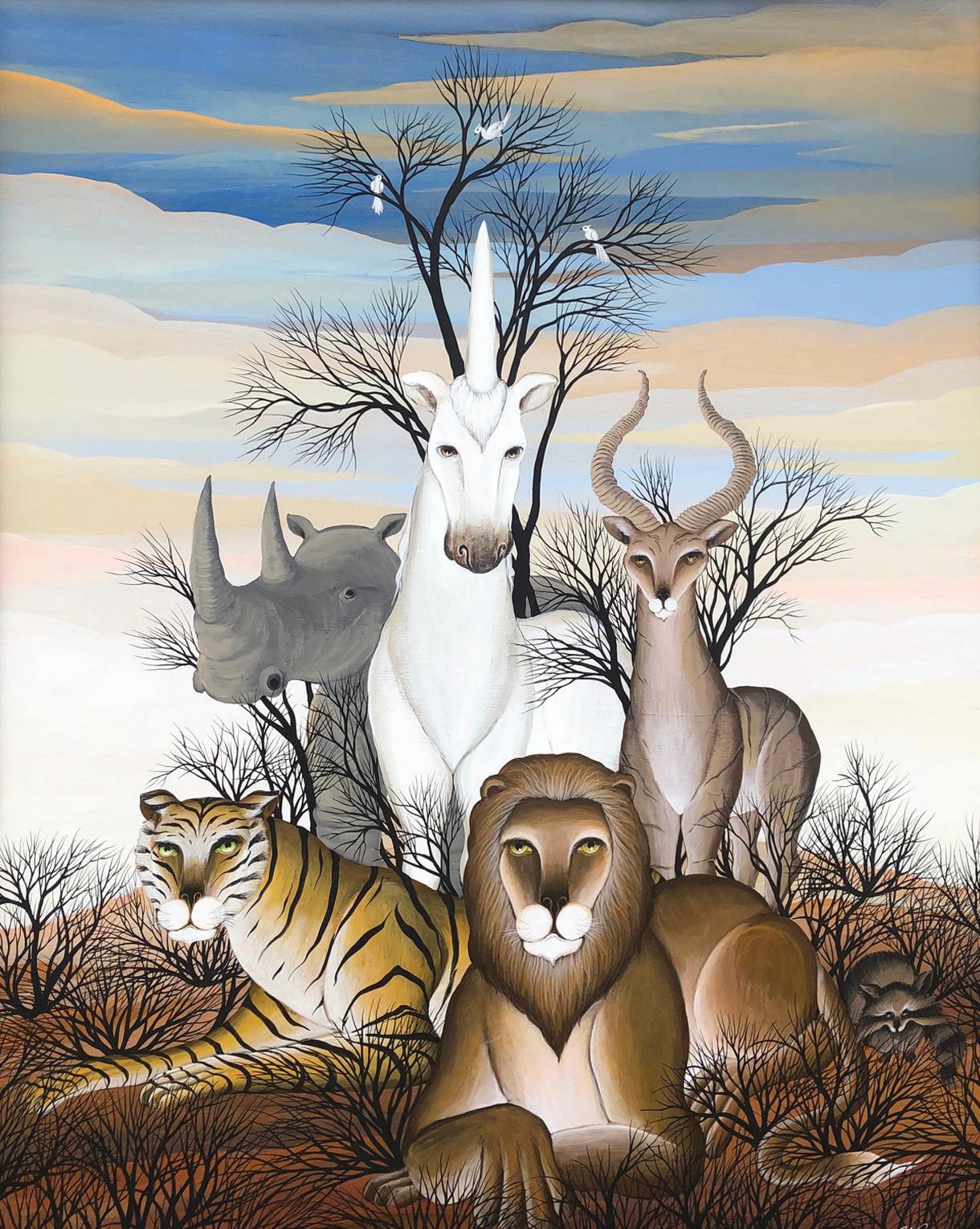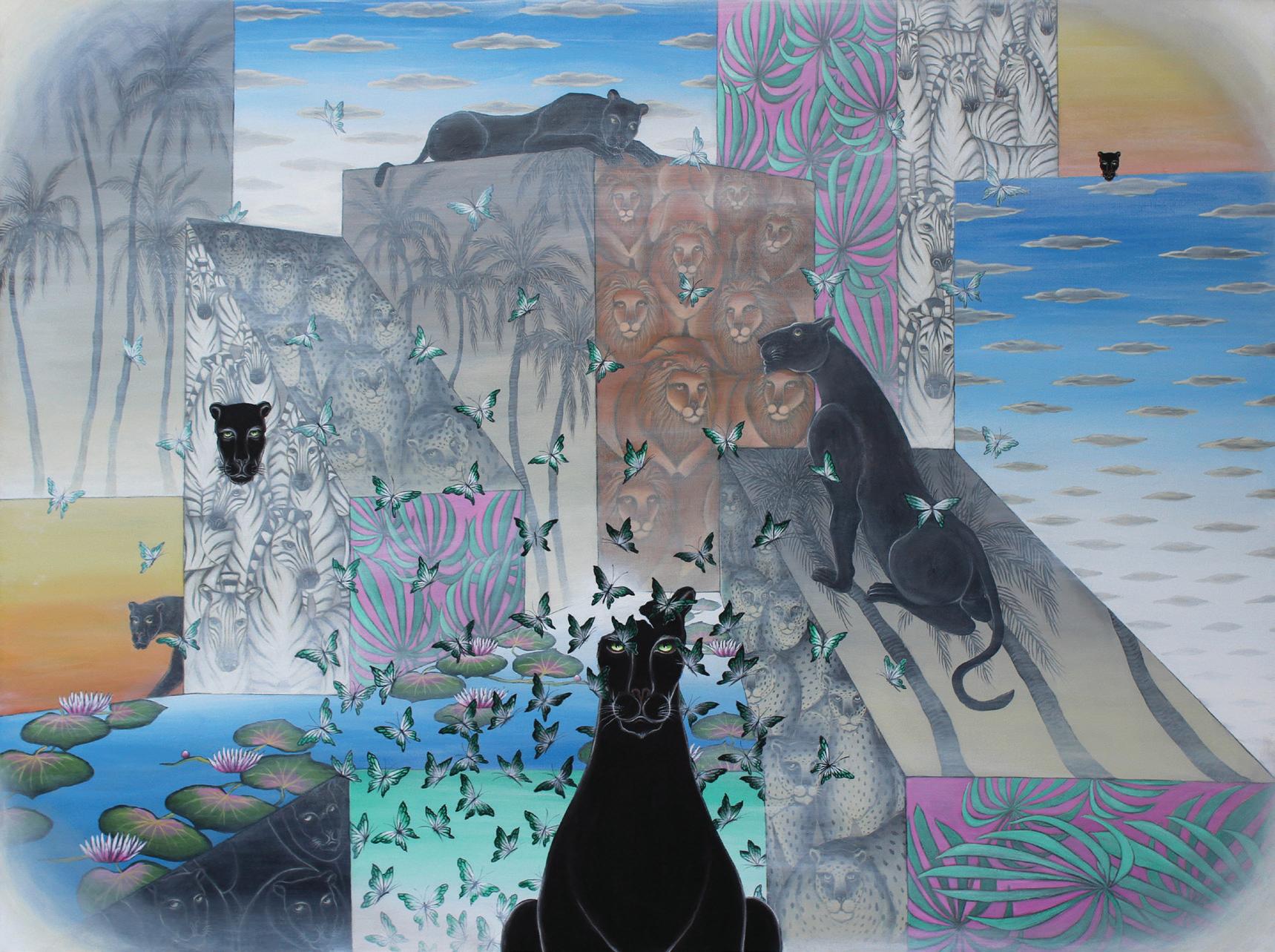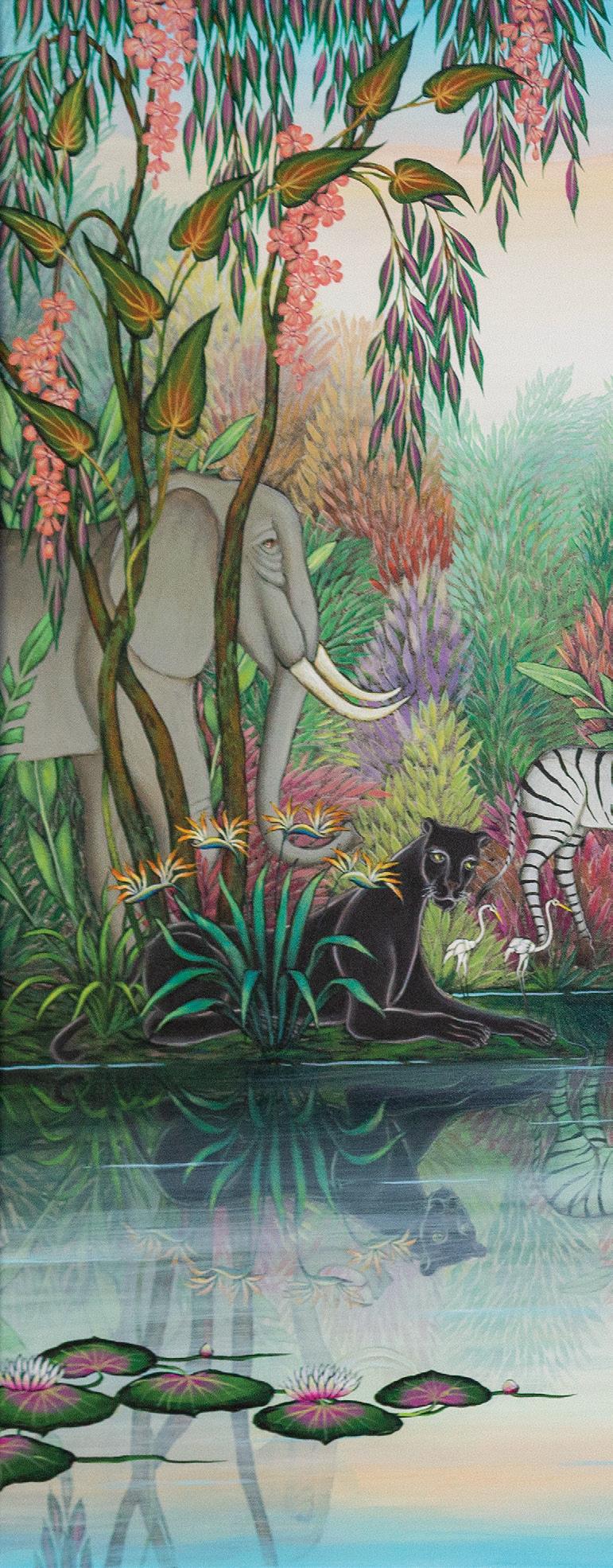With this premise in mind, Novoa constructed a dream-like new jungle where the lion lies down with the zebra. Panthers and pandas share the shade with African monkeys and American raccoons. The radiant colors of Novoa’s luxuriant foliage seem to wield a mystical power of bringing together predator and prey, the meek and the strong.