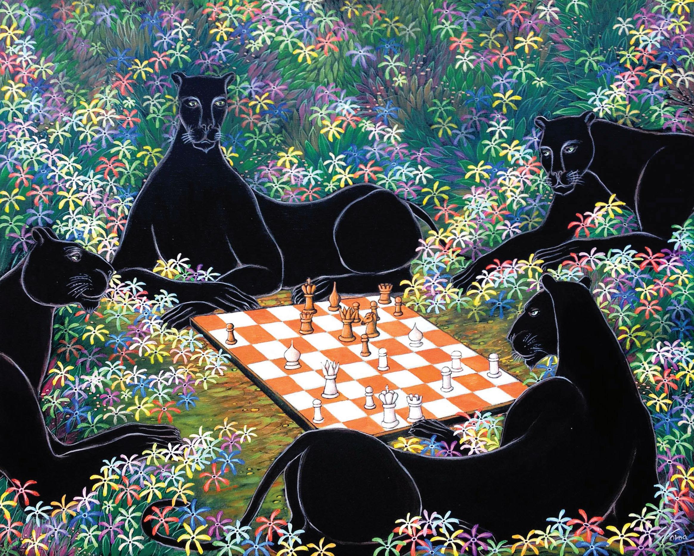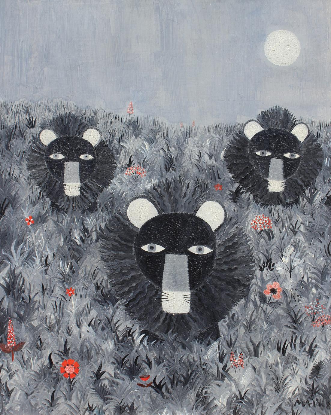 Her subjects evoke the initial impression of “primitive” or “naïve” painting. She is occupied with a world that seems linked to a Golden Age or a lost Garden of Eden. Her forests and fields are filled with gentle creatures of the jungle living together in peace. The benign lions and tigers are the pets of the bemused children who play in the forests.