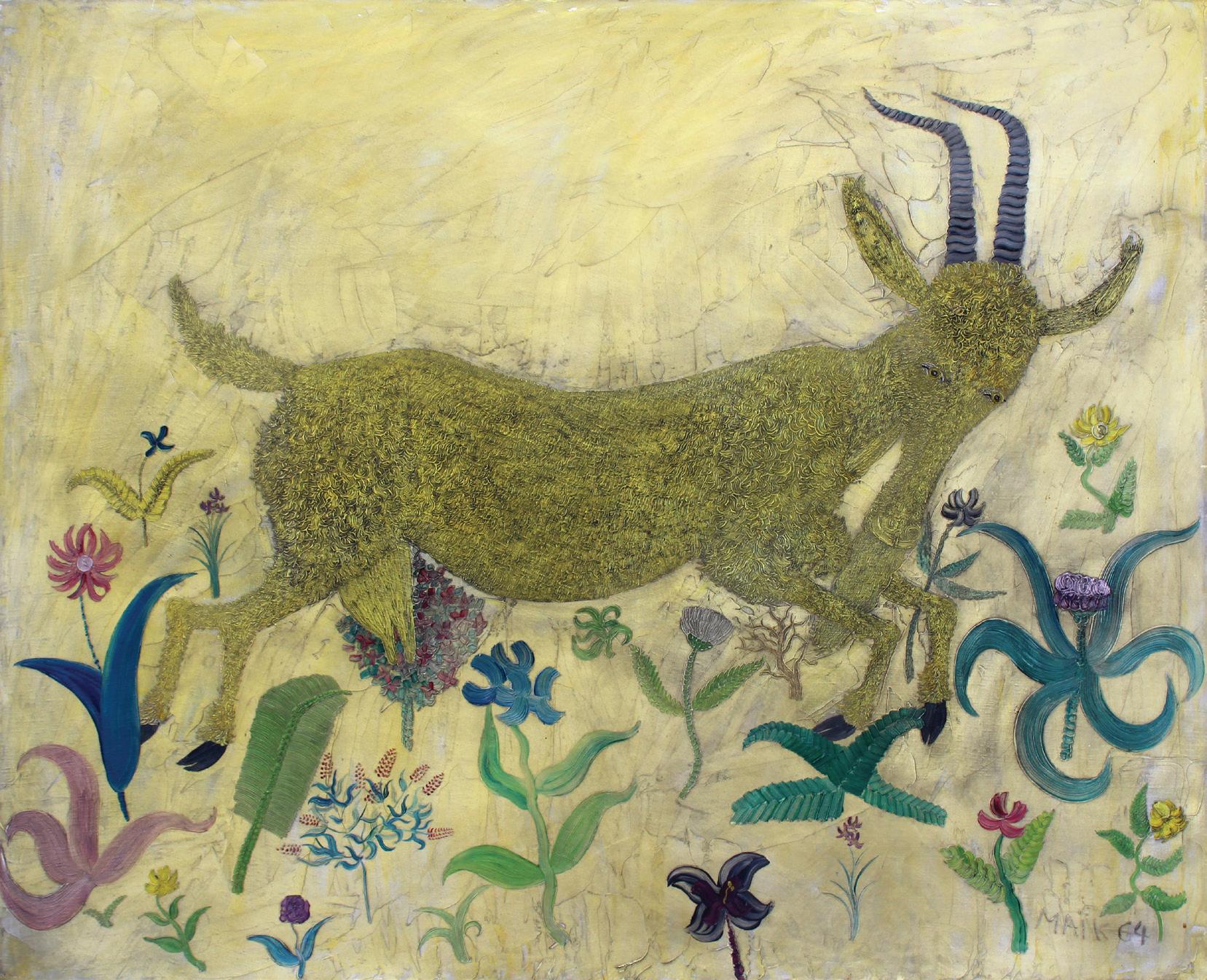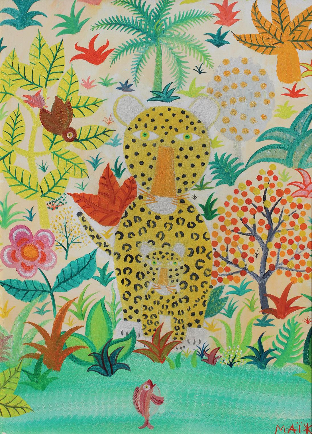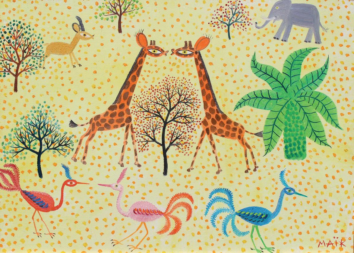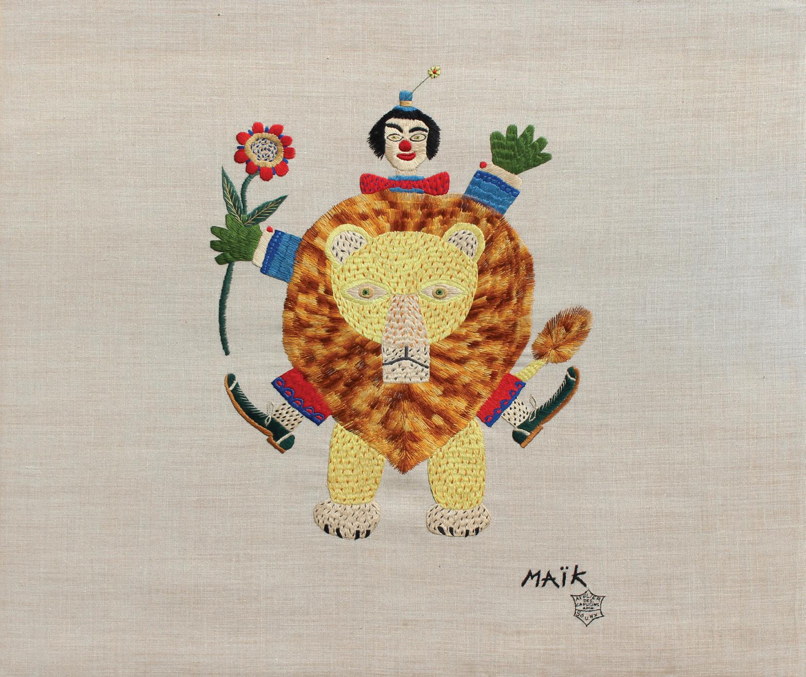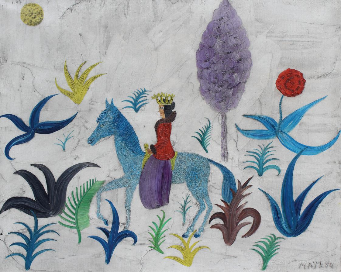 Maïk’s palette ranges from muted, nearly monochromatic tonalities to accents of sharp, arresting color notes, which have an intense staccato quality. Maïk combined certain qualities into his paintings that suggest elements of folk art, primitive painting and mosaics and textile art. He drew strongly on the world of fantasy for images, which have overtones reminiscent of Mayan or Aztec legends, the Arabian Nights Tales, and even Hans Christian Andersen.