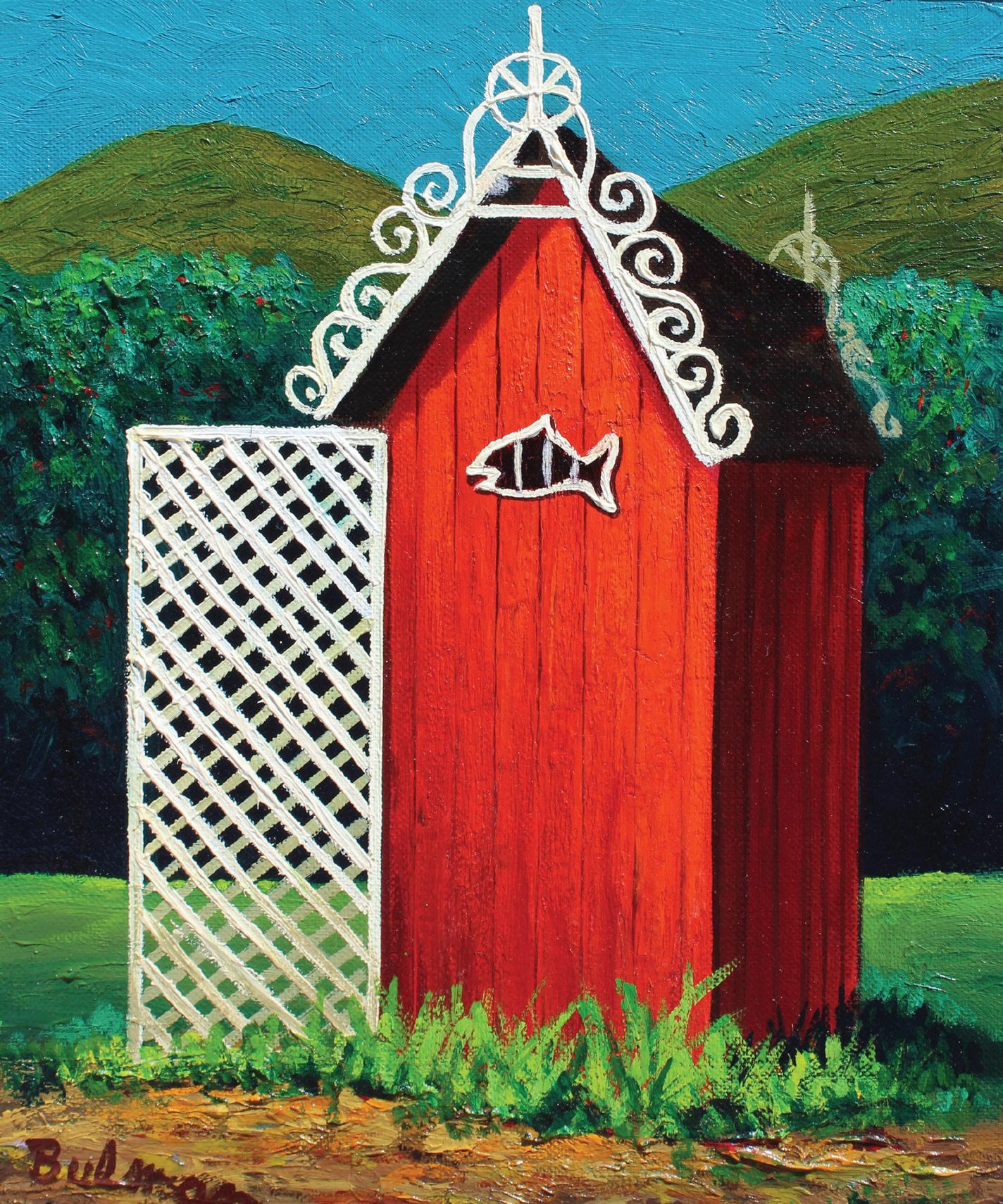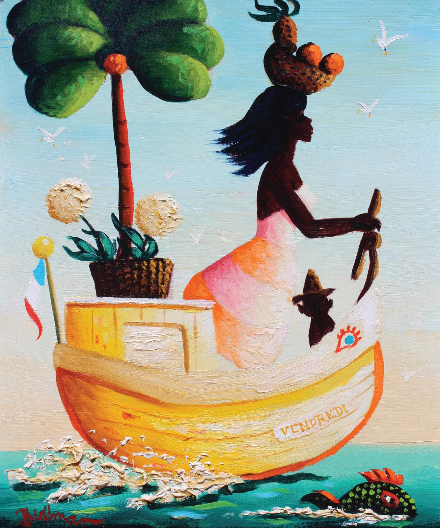 During the early 1950s, Bulman saw pictures of Haiti and admired the island’s style, verve and gracefully trimmed houses with lacy appliqué carved wood. He visited the island for the first time in 1952 and later traveled to other Caribbean islands. Bulman loved Haiti and its people and felt that they were the best inspiration for further work. He lived with the islanders in the rustic hills for a time and felt like he was a part of their village, deeply experiencing their religion, humor, and lifestyle and respecting their way of life far better than other Americans. The Haitians loved his art and encouraged him to continue creating his whimsical scenes of elegant women and men and playful children.