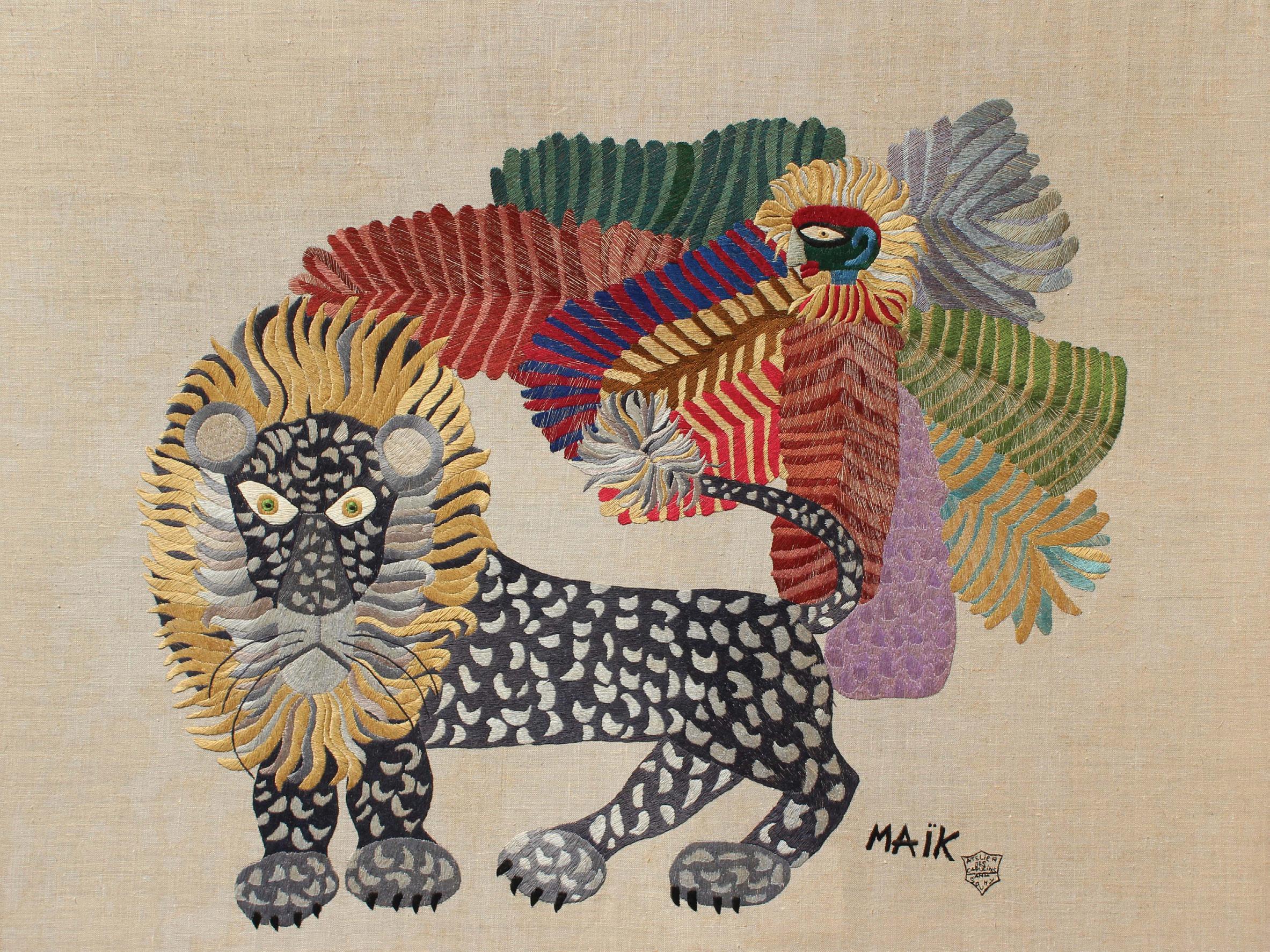Although Maïk described himself as a “primitive” painter, his compositions are intentional and carefully structured. His worlds—filled with rare birds, animals, stylized flora, and rhythmic landscapes—are rendered with clarity rather than naïveté. Scale shifts, flattened perspectives, and symbolic meaning fold naturally into his visual language. What truly distinguishes Maïk’s work is its serene atmosphere, defined by balance and harmony. His creatures coexist peacefully, engaged in quiet narratives of play, rest, and companionship. Each painting becomes a small world into which the viewer is invited, led not by text but by color, pattern, and form.