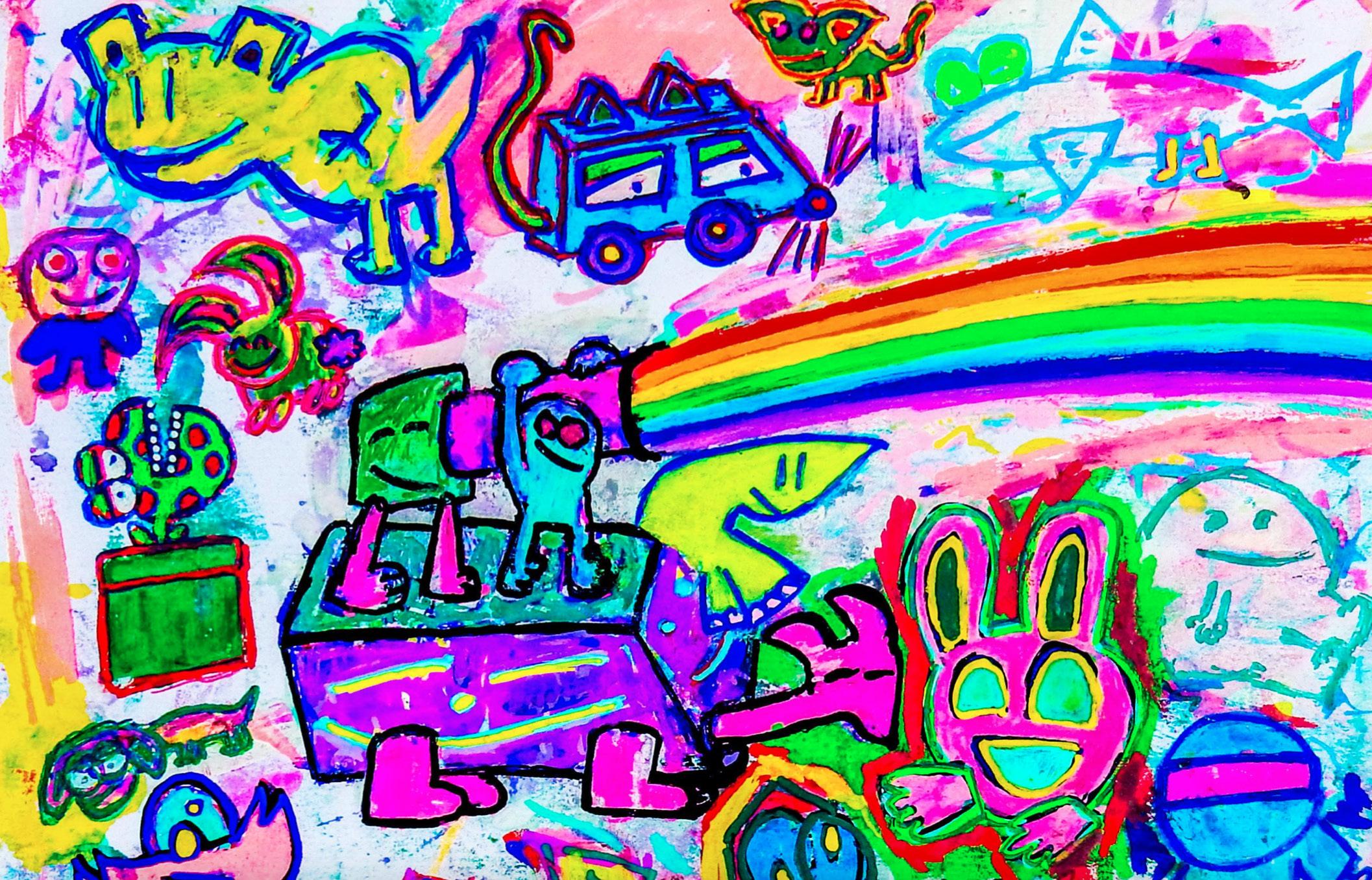 The exhibition features a 4 to 5-minute looped projection where Ben’s colourful artwork, animated by artist Sue Wegener and supported by the projection art team at illuminart Stories in Light, is brought to life through colour, movement and scale while Christobel’s electronic music fills the room – inviting