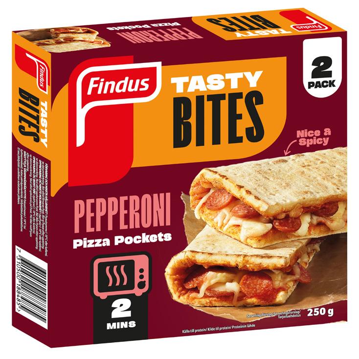 Findus nya småmål, nyheterna Tasty Bites är framtagna för tillfällen som passar perfekt för den som letar efter något gott och snabbt att tillaga. Här finns bland annat två olika sorters ”pizza pockets”, vikta fryspizzor, som är klara i mikrovågsugnen på endast två minuter. Pizzorna finns i smakerna pepperoni eller tre sorters ost. Eftersom pizzorna är vikta slipper man bli kladdig om händerna, och de kan dessutom enkelt ätas på språng med en hand eller framför datorn, jämfört med andra ”öppna” fryspizzor.