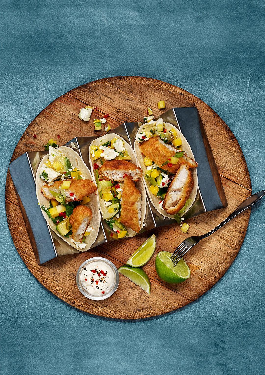 Dela varje fiskfilé i fyra bitar, lägg två bitar i varje taco.