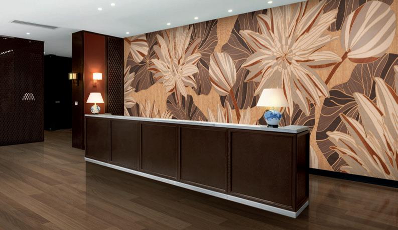 Custom inlay effect of L15-2201 Lotus - Coral achieved by printing various species of high-resolution veneer images onto real Sanfoot veneer.