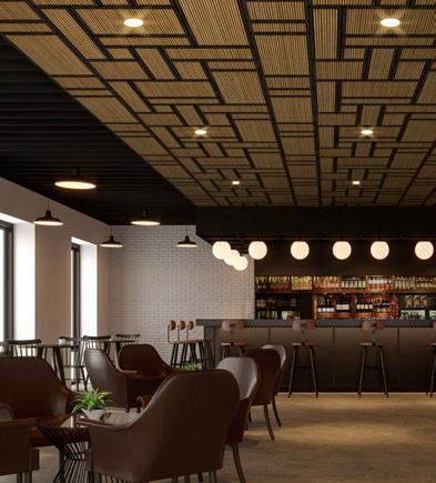 BEAMS: Wood veneer image printed on acoustic panels, installed as faux beams.