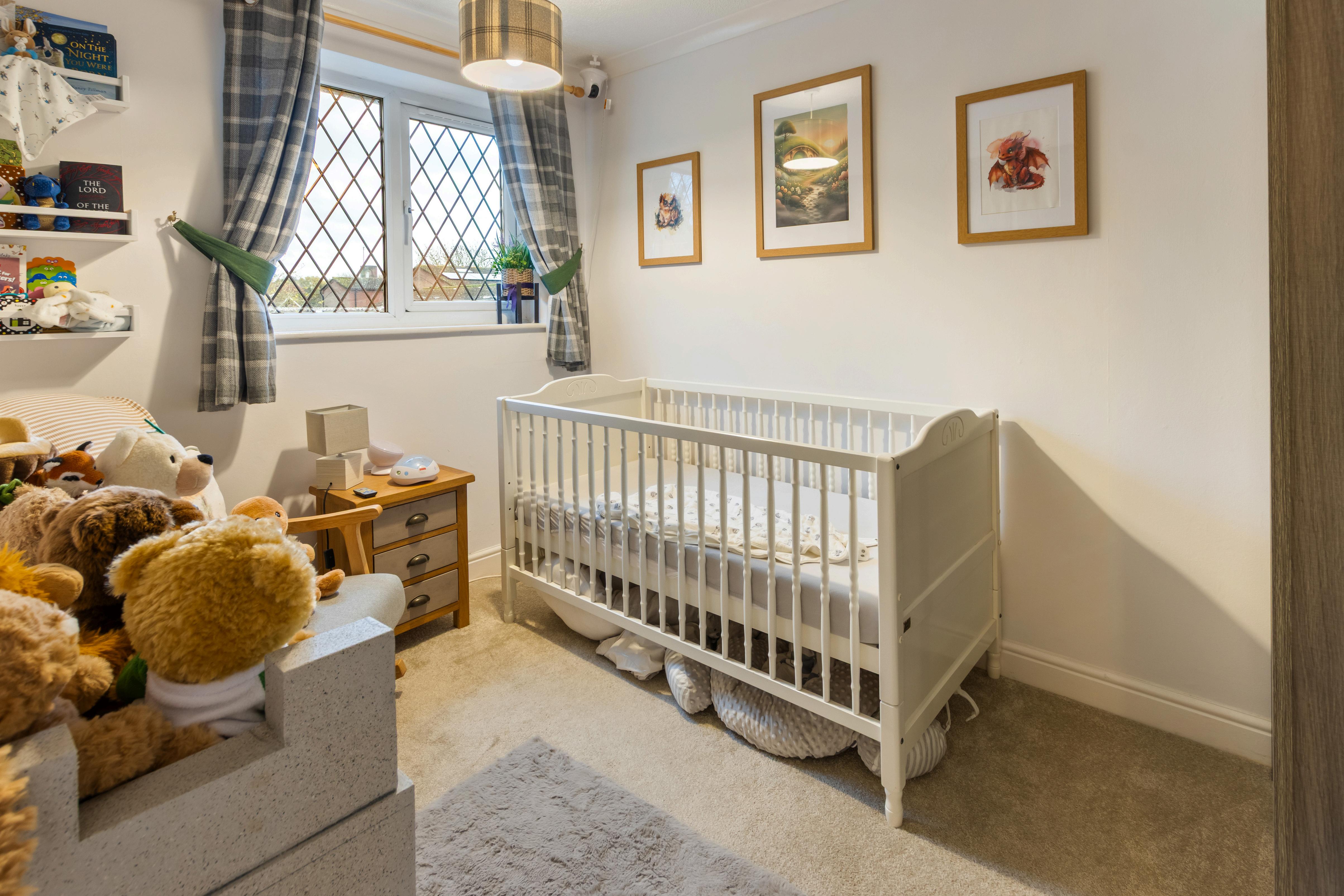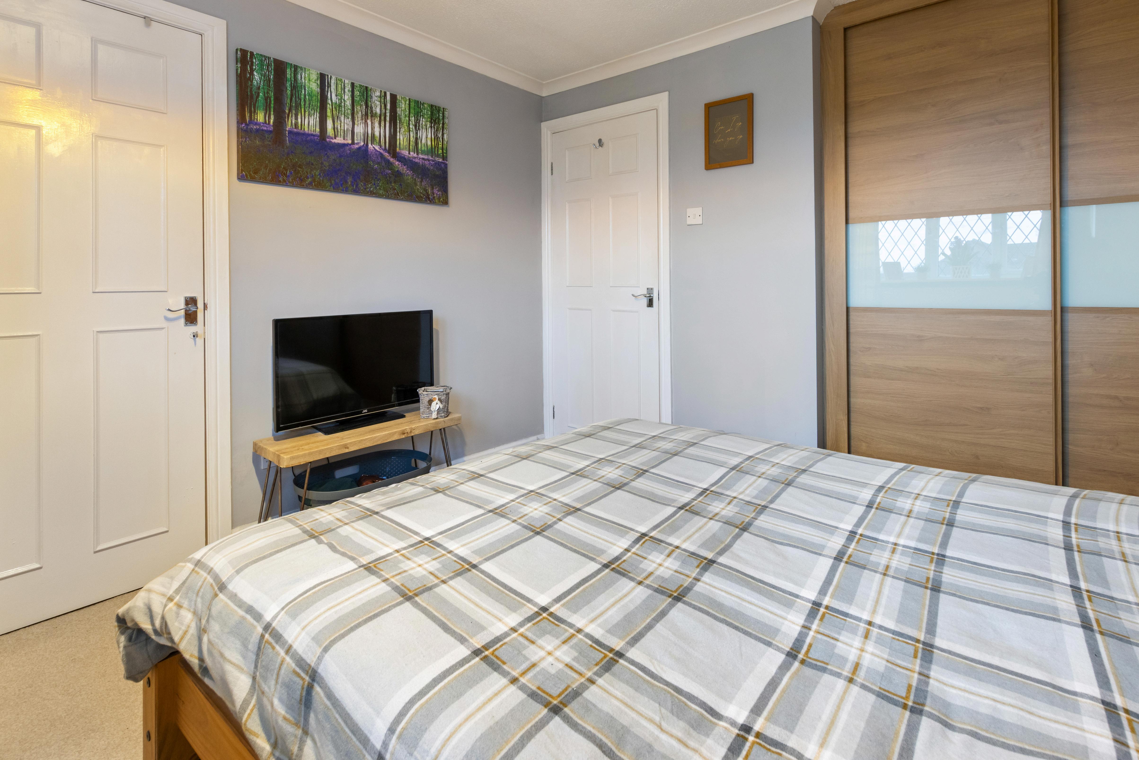 Upstairs, the landing includes useful built-in storage above the stairs and leads to two good-sized bedrooms. The main bedroom enjoys a pleasant outlook through a front-facing bay window, with ample room for a large bed and additional furnishings. Bedroom two is a comfortable single or small double ideal as a nursery, guest room, or home office.