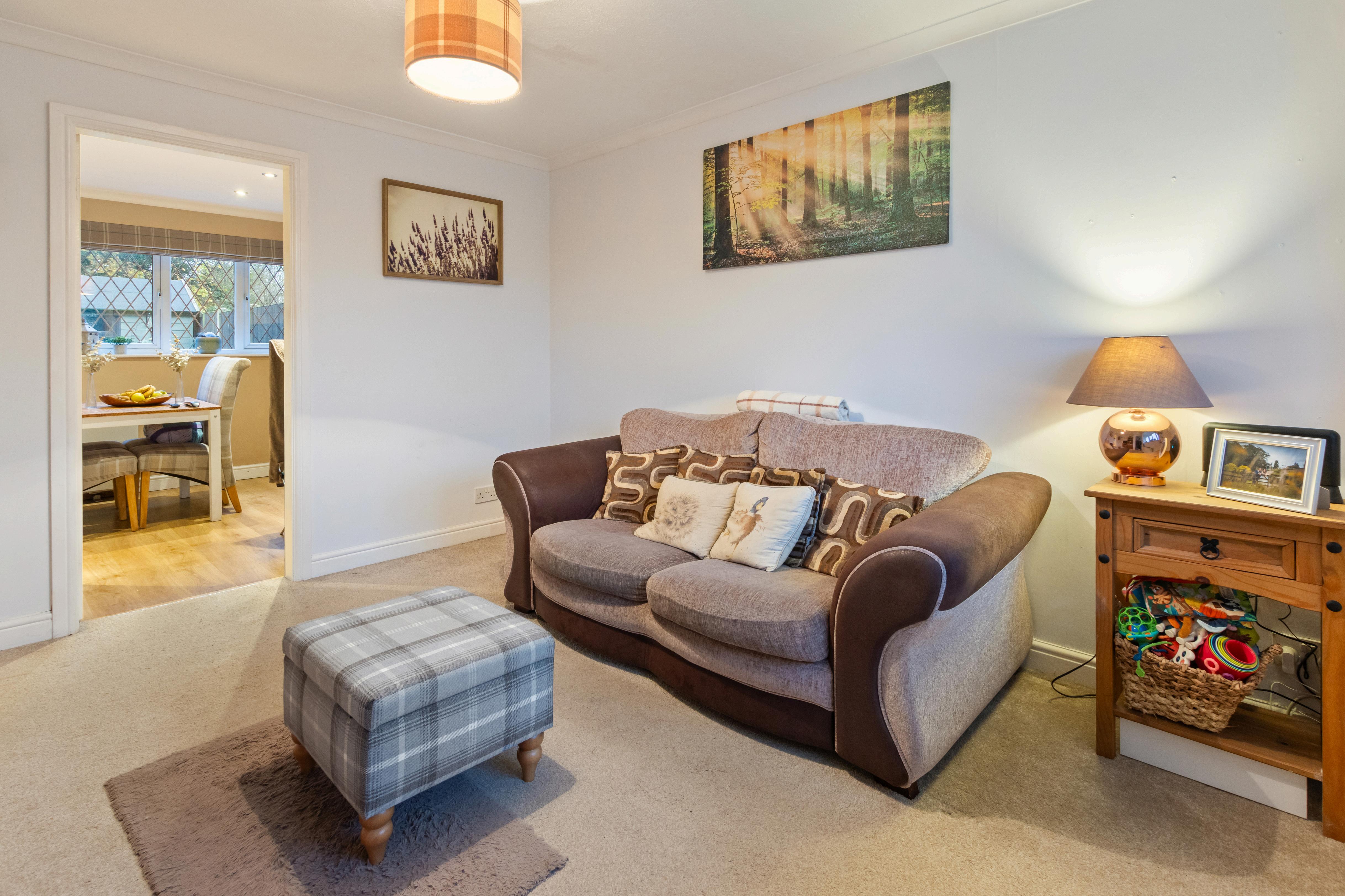 This inviting home opens into a comfortable lounge, naturally bright thanks to a wide front window with diamond-lead detailing. The room offers plenty of space for a cosy sofa suite and media unit, with neutral décor that provides an easy backdrop for any style. There is also essential storage that sits under the stairwell.