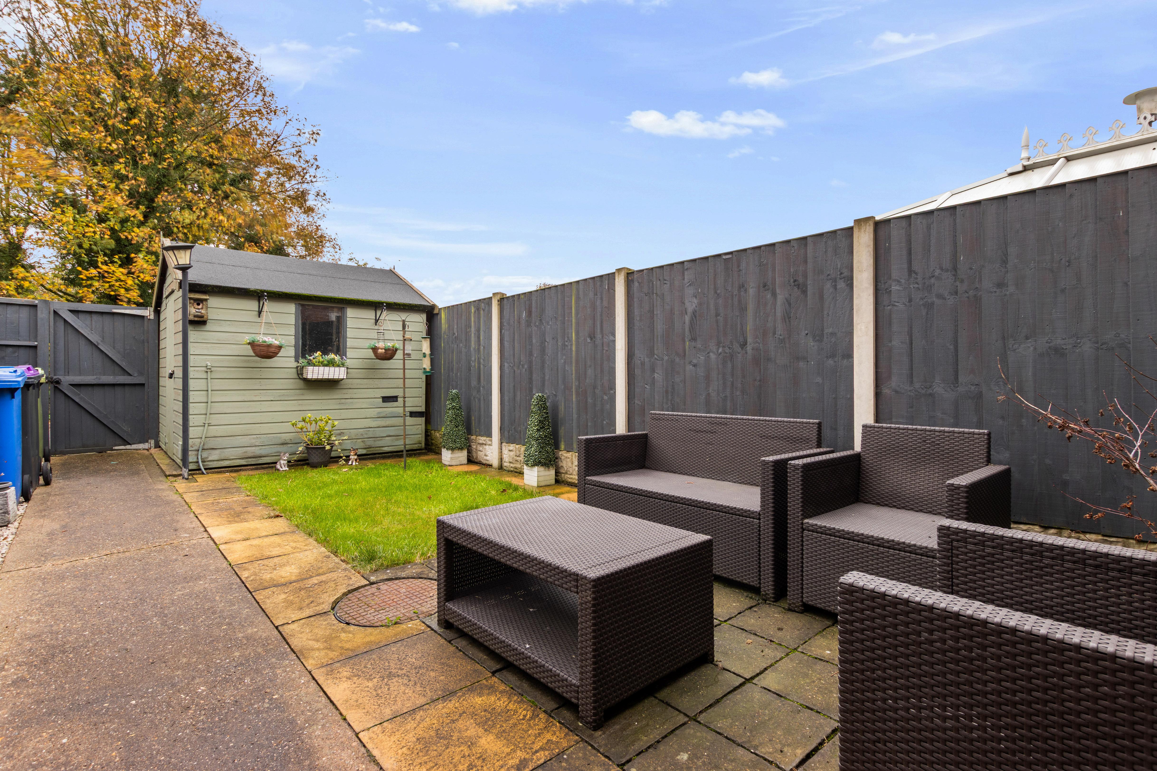 To the rear, the enclosed garden offers an easy-care outdoor space with a blend of lawn, patio seating area and a useful timber shed. It’s perfectly sized for young families, pets, or relaxed summer evenings.
