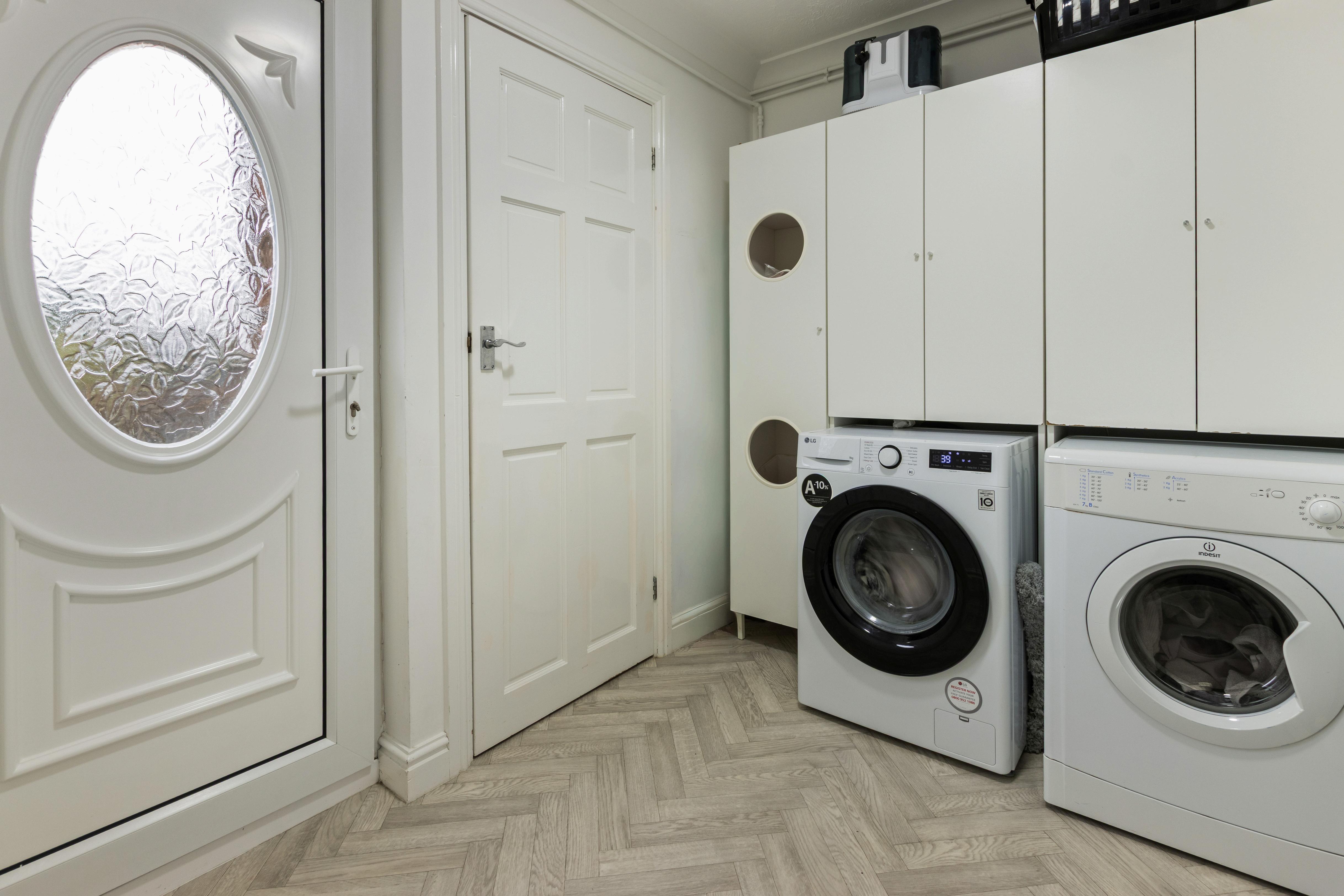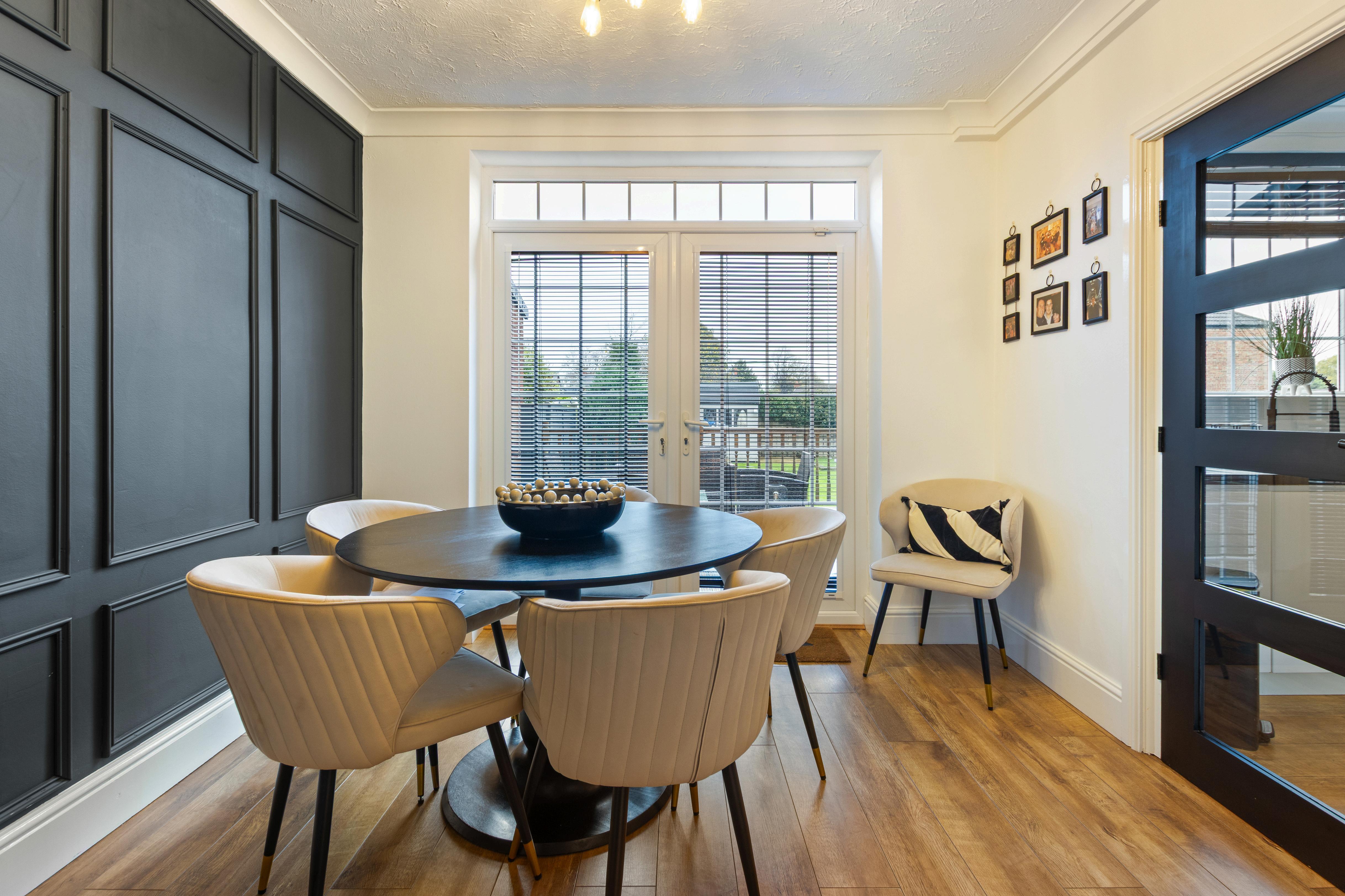 Welcome to this beautifully presented three bedroom semi detached home on Crowland Avenue, offering style, space and practicality throughout. The entrance hallway leads to a comfortable lounge with a striking feature fireplace, perfect for cosy evenings. At the rear, the dining room impresses with elegant wall panelling and French doors opening onto the garden, while the modern kitchen boasts a range of fitted units and integrated appliances. A handy utility room, ground floor WC and internal access to the garage currently used as a home gym add convenience.