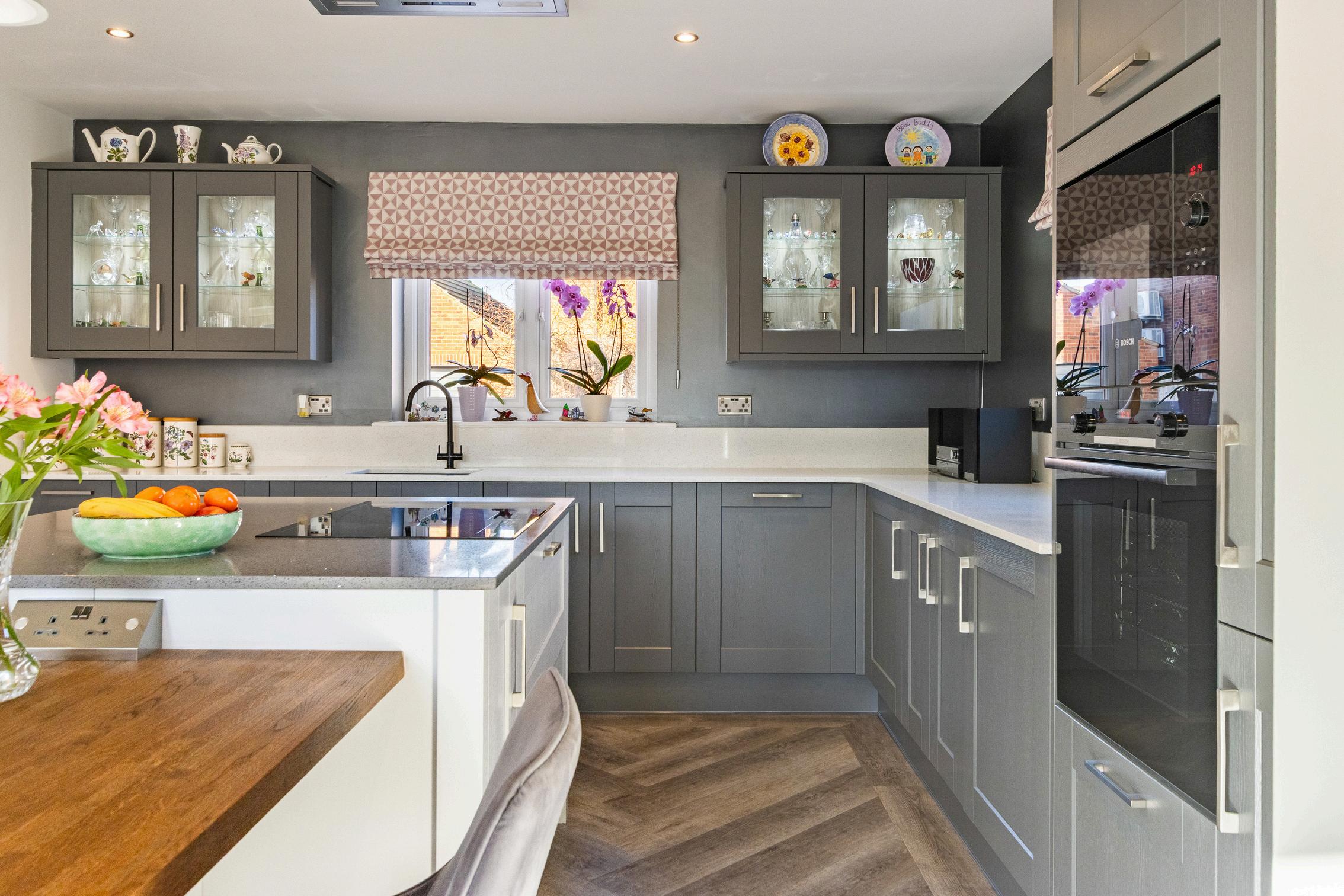 The stylish breakfast kitchen is fitted with modern units, granite worktops, central island, integrated appliances and French doors opening outside, with a separate utility room providing additional practicality.