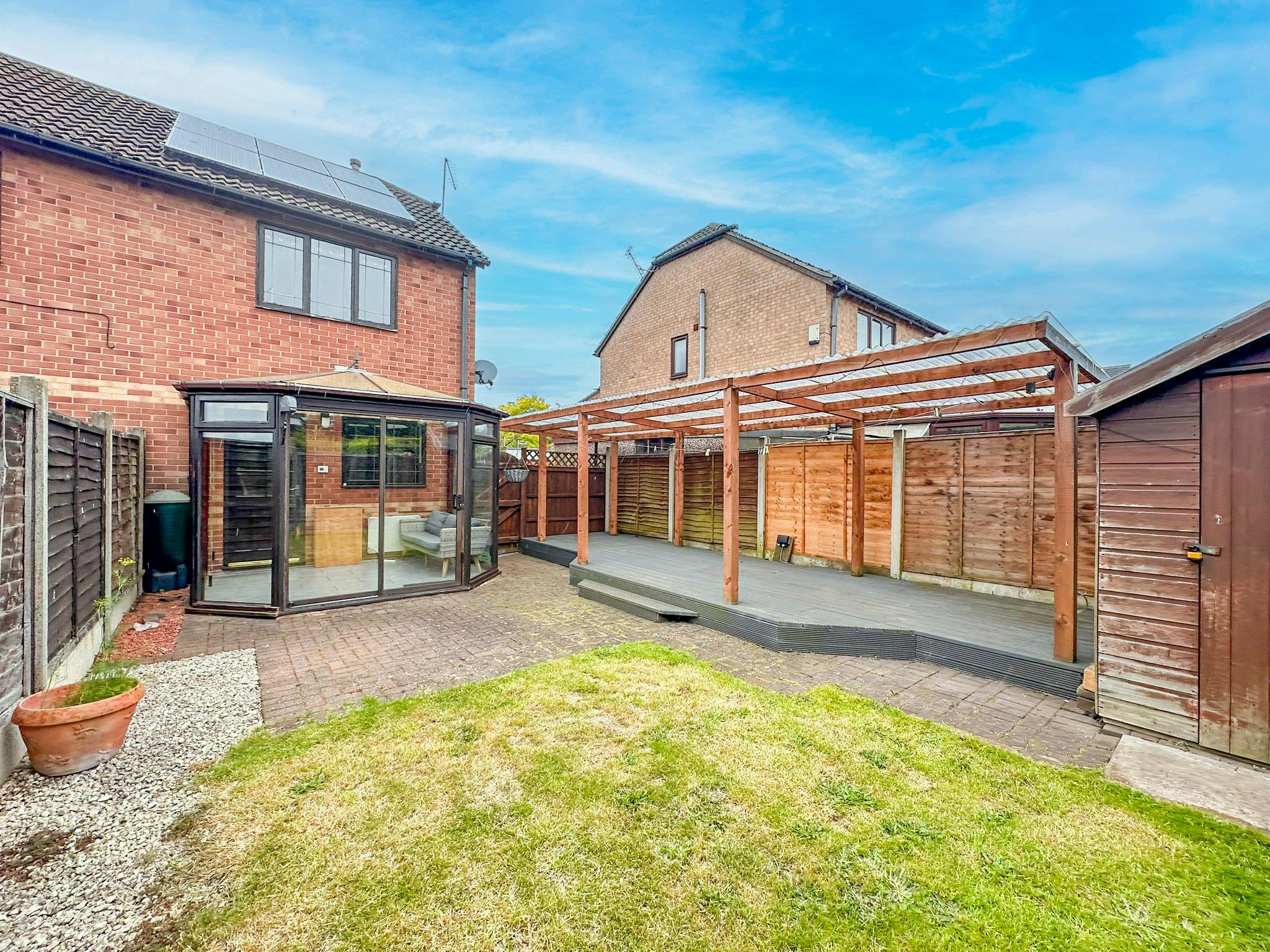 To the front, the property boasts a neat, low-maintenance garden mainly laid to lawn, complemented by a concrete driveway providing off-road parking for two vehicles. A paved pathway leads directly to the front door, offering a welcoming approach. The enclosed rear garden is a private and well-designed outdoor space, primarily laid to lawn and featuring a timber-covered decked seating area ideal for relaxing or entertaining. Additional highlights include a block-paved patio and a timber shed, perfect for extra storage. The entire garden is securely enclosed with timber fencing, ensuring both privacy and security.