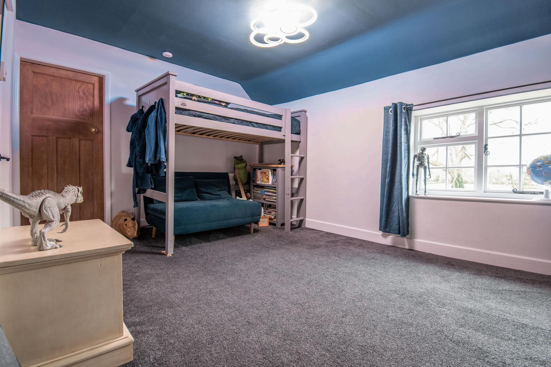 The landing leads to the third bedroom which has a feature quirky spindled staircase and has been left in situ as a nod to the past, where it is t seasonal farmworkers used to sleep in the loft. Bedroom three is a spacious double with a decorative wood painted fireplace and built-in ward