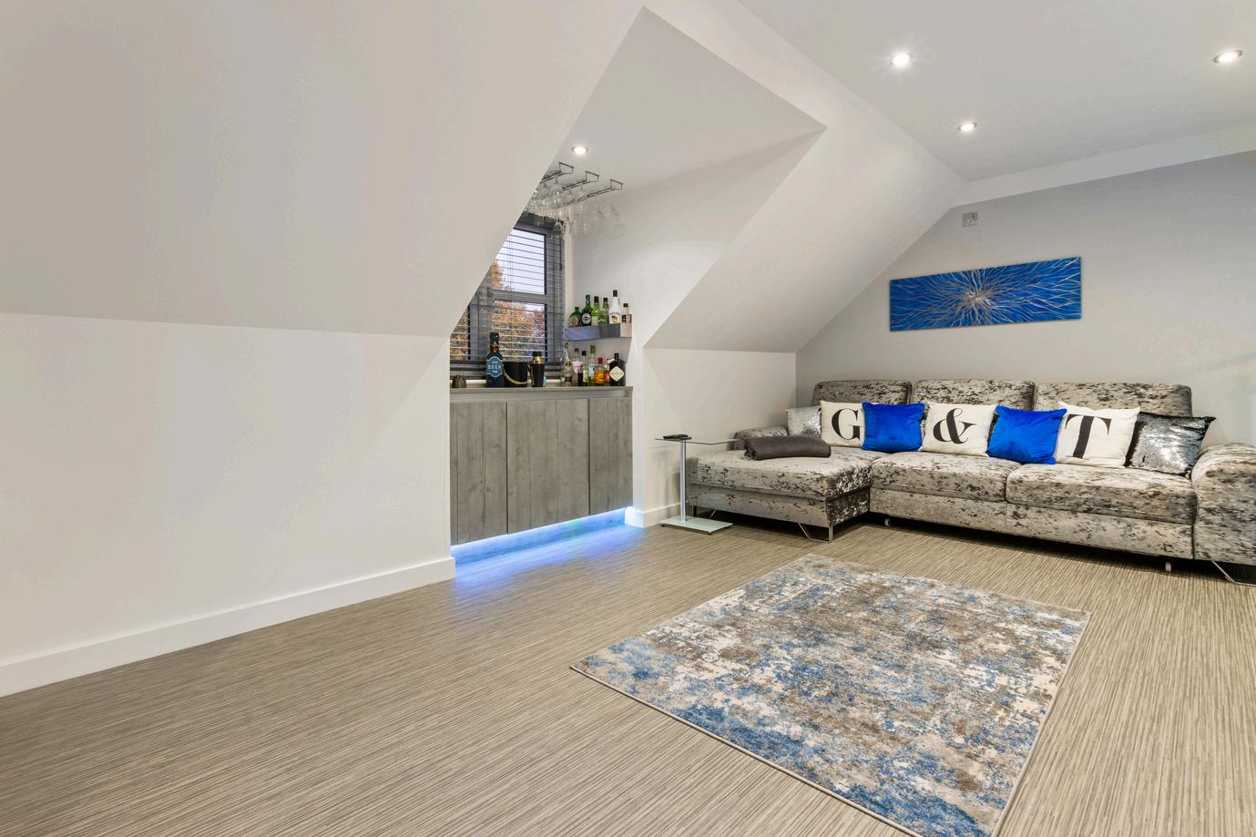 The principal suite is a luxurious retreat, with a vaulted ceiling, forward-facing window, and inset wood-effect gas fire. A fully fitted dressing room leads to a contemporary ensuite bathroom, finished with high-end tiling, mirrors, and lighting that create a dramatic interplay of shadow and light. This suite is designed for indulgence — a private sanctuary where you can unwind at the end of the day in comfort and style.