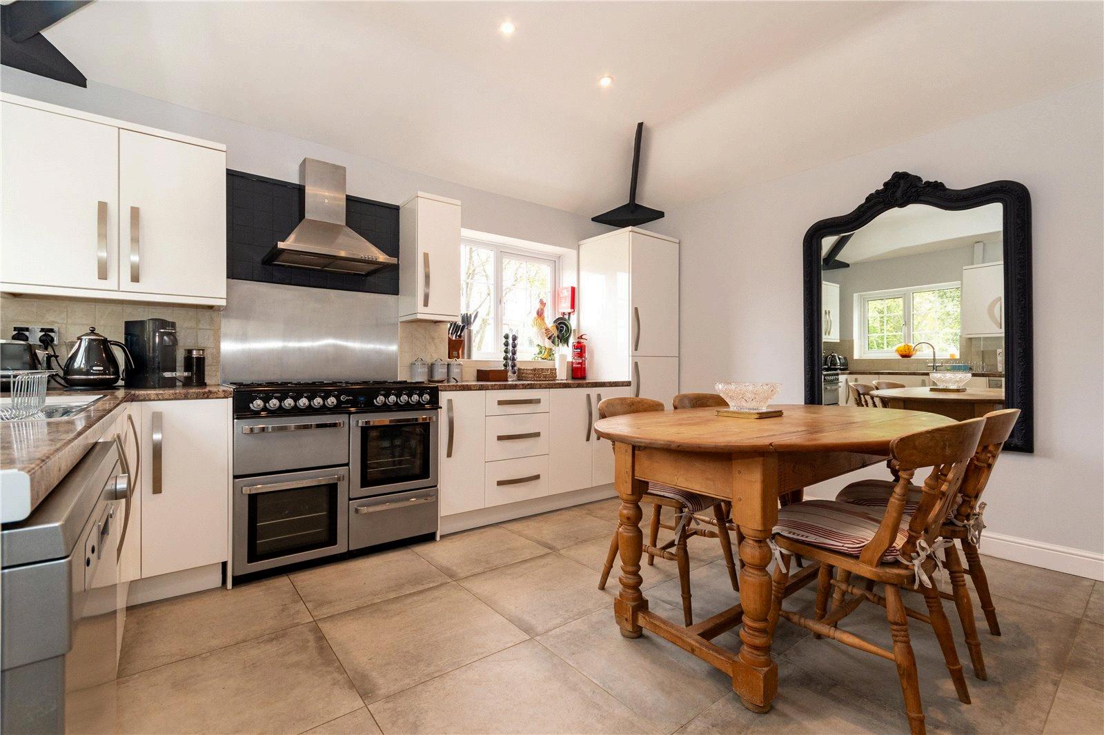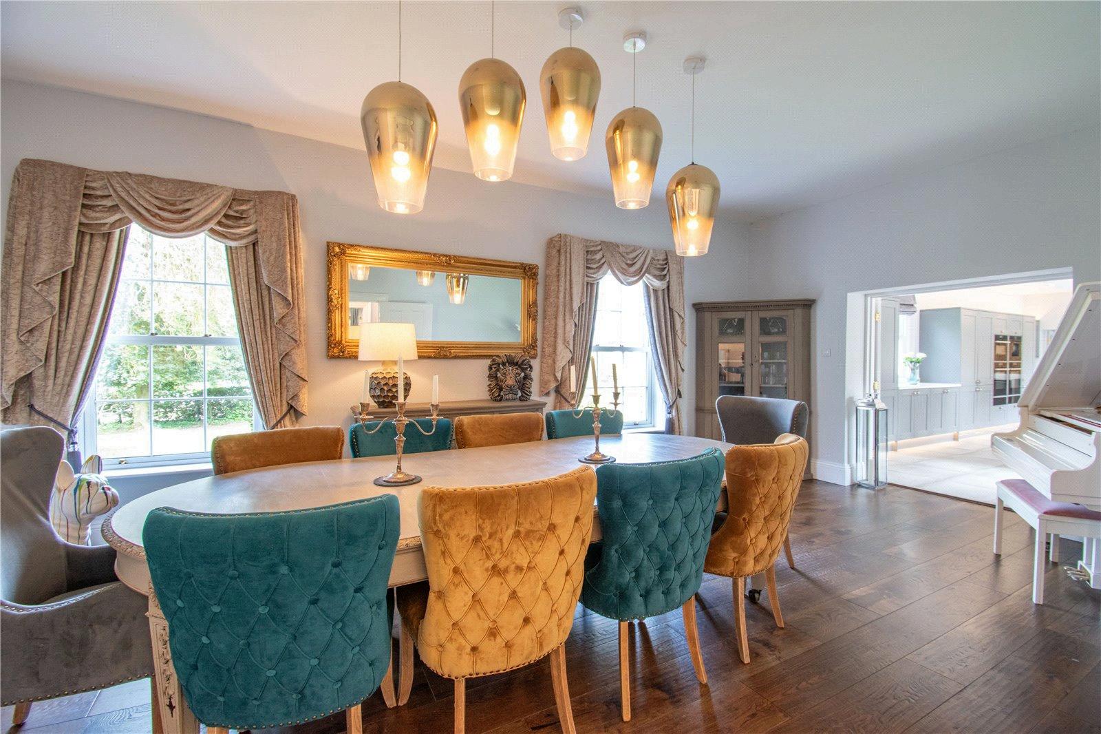 Two reception rooms flank the front of the hall the principal being an expansive dual aspect living room which is arranged in two sides defined via a broad arch, each side has a period fireplace, one with an open grate the second with a wood burningstovestylefire.