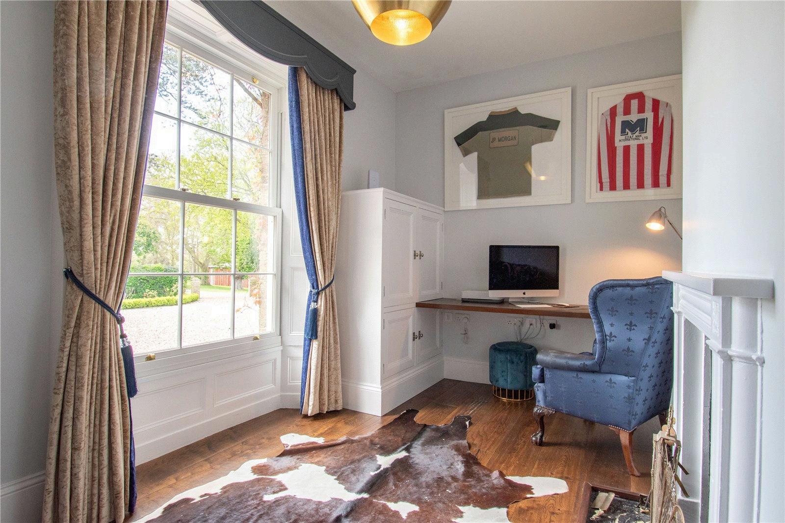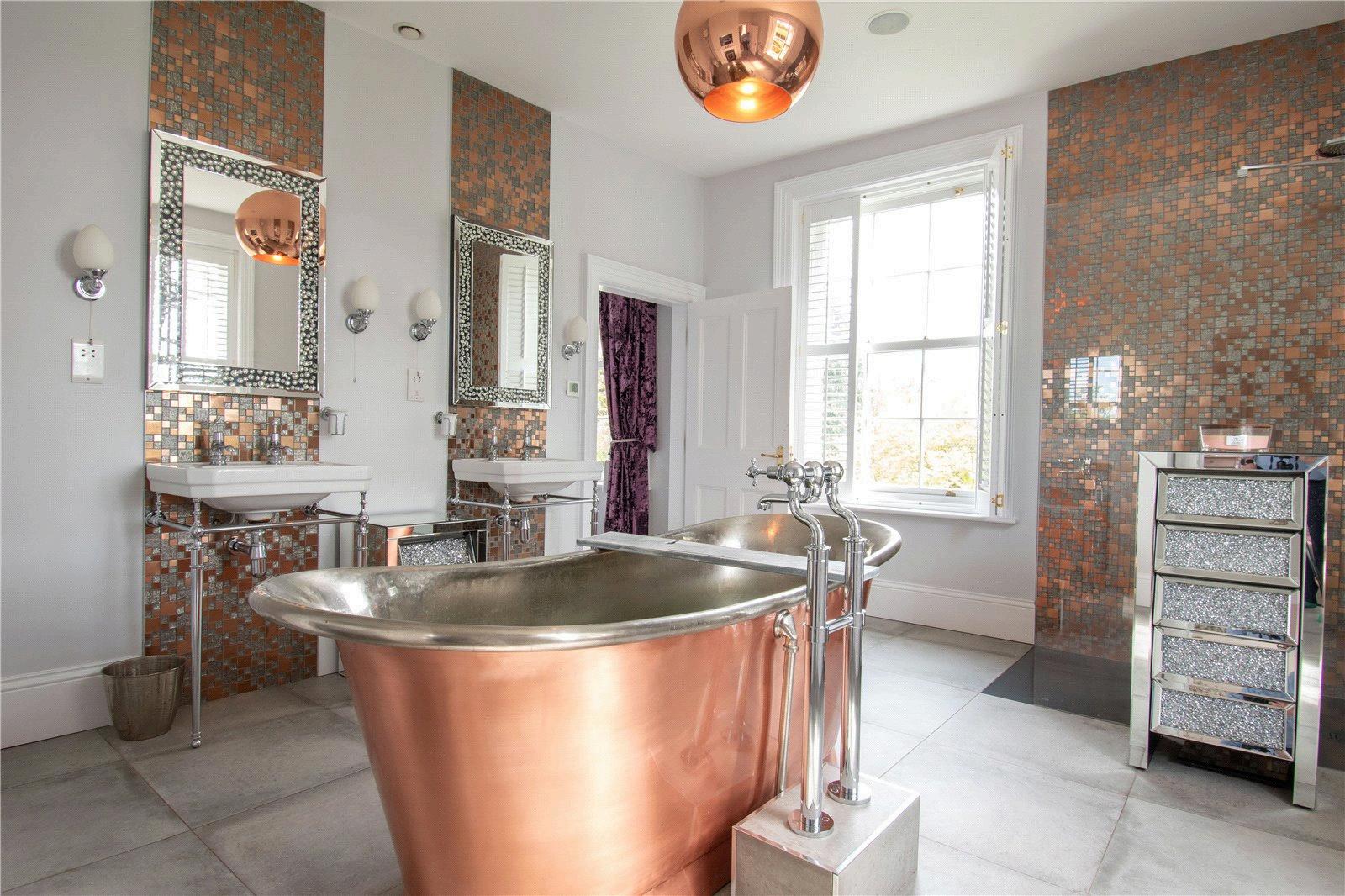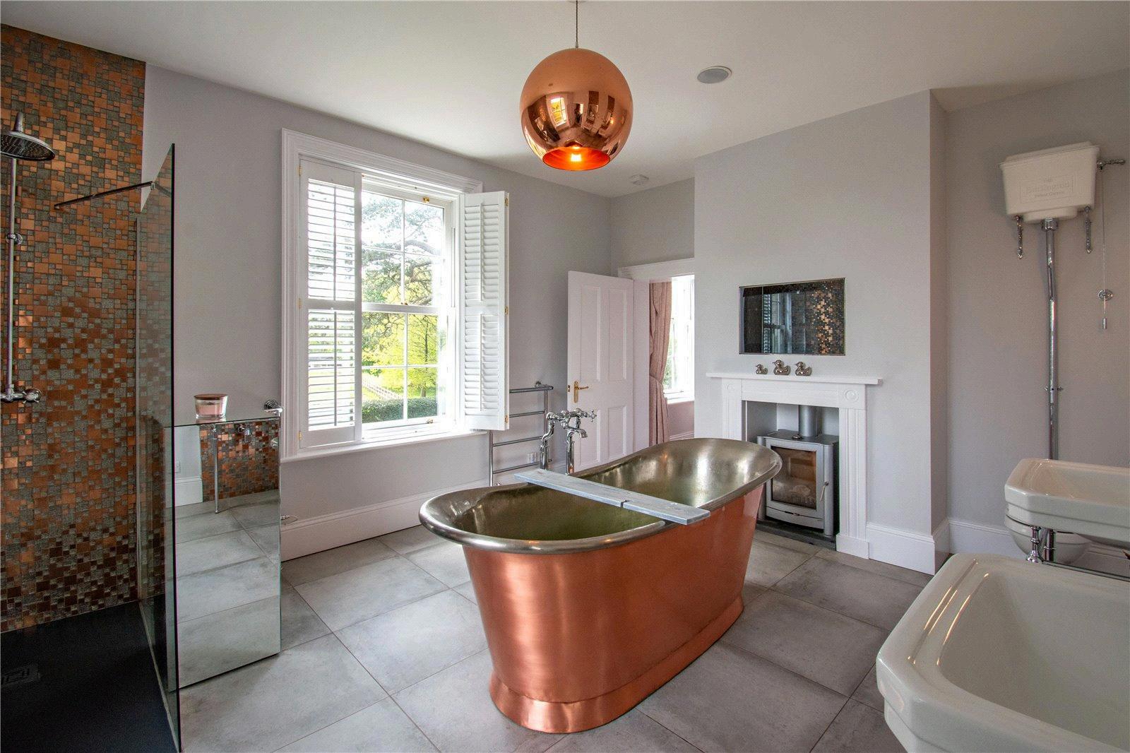 The reception hall staircase leads to the central landing on the original side of the house. The owners have taken three of the original rooms to create their own luxurious suite. The principal bedroom has twin windows providing garden views andaperiodstylefireplacehasamodernwoodburningstove.Adooropenstoan indulgenten-suitewithafeaturecooperbathdesignedtocreateanopulentspace to relax. A wall mounted aqua vision television is above the fireplace which has a wood burning stove, there are twin sinks, a high flush w.c. and a seamless screen shower enclosure which continues to blend the traditional and contemporary styling.Completingthesuiteisafabulousdressingroomwithfittedwardrobes,and a decorative fireplace once an independent bedroom, which could easily return to beingaccessedfromthelandingtomeetafamily’sneeds.