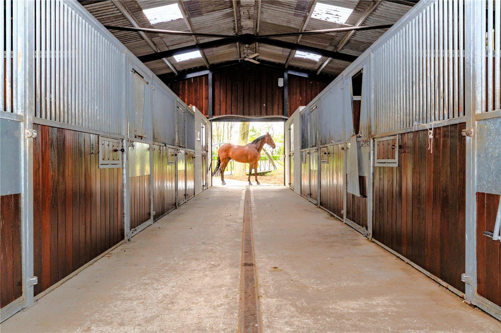 TheenviableAmericanstyleBarnisanequinedelightwithwindowedstablingfor18 large horses all benefiting from rubber matting, automatic water system and roof mounted cooling fans. A separate rug room complete with heated six bar rug rack andafeedroomwithgalvanizedstoragebins.Totheheadofthebarnisalargetiled hotwaterwashareawithcantileverhosenexttoasolarium,specificallyinstalledto ensure that it is easy to turn the horse, making grooming as pleasant a task as possible for horse and groom. The tack room facility is more like a rest room. This secure room has a fitted modern kitchen and laundry area, with integrated appliances.Aslidingmirroreddoorclothingandtackstoragewardrobetothequality foundinmanyhousesandarider’smodernshowerroom.Toaddtothepracticality ofthisareadrainageisinstalledthroughoutalongwithWi-Fiandsecuritysystem.