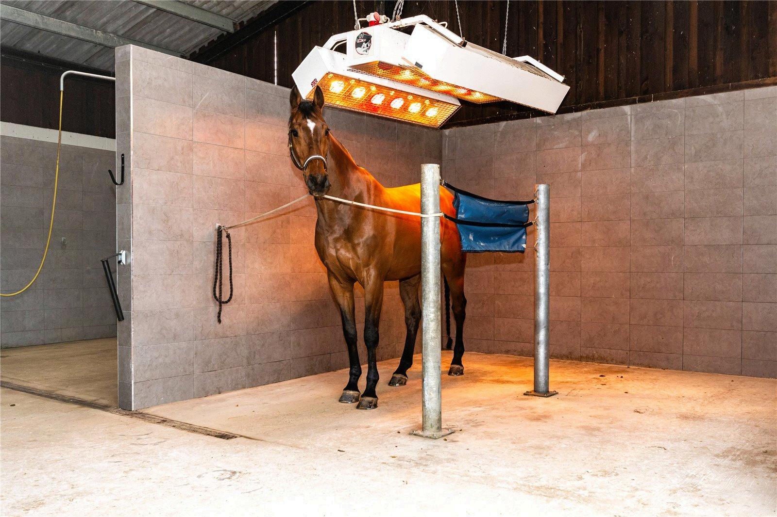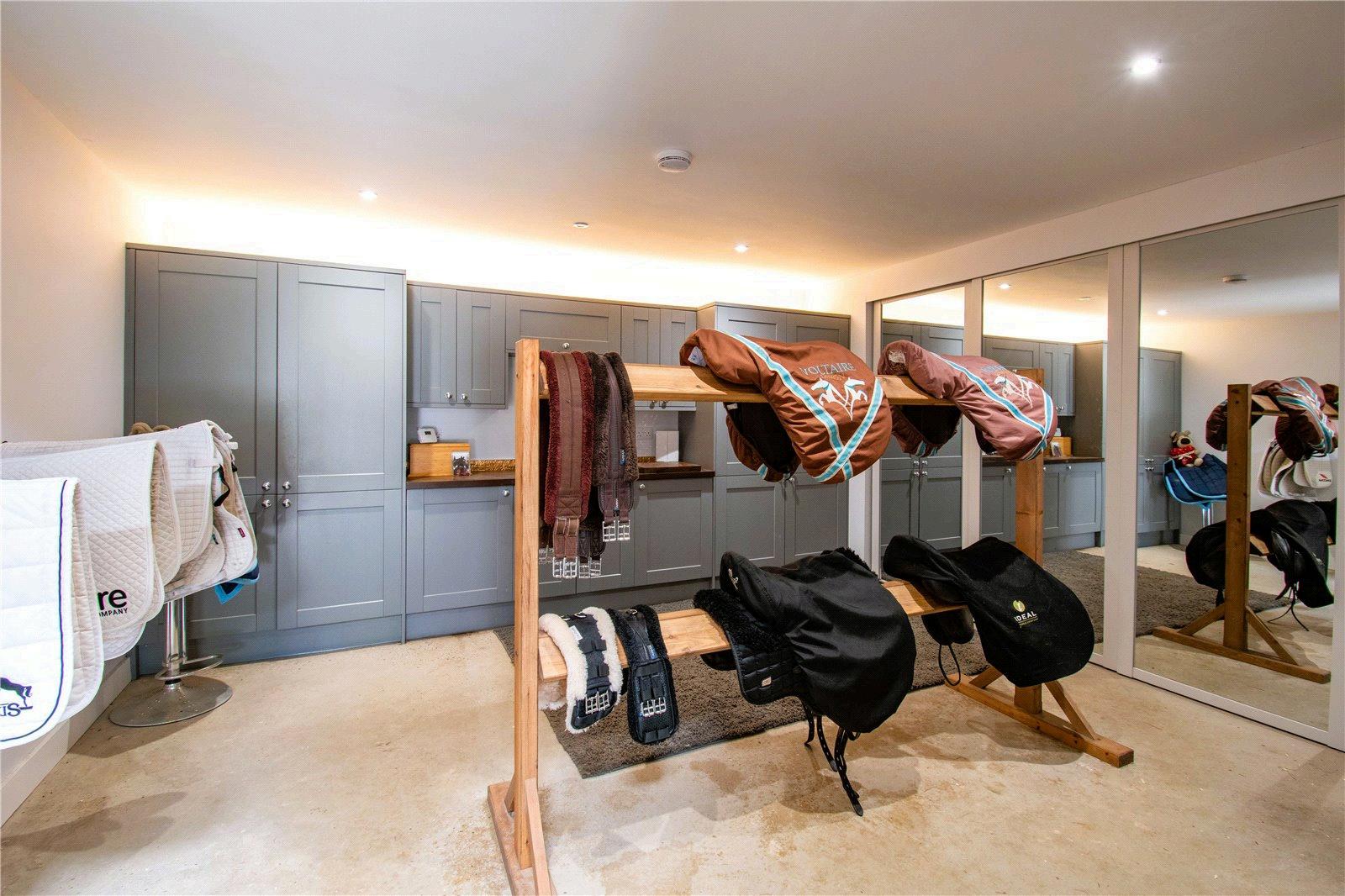 The Main Stable Block 18 lodden style stables with auto drinkers. Solarium & grooming area, cross ties, area with electrical points for clipping. XL Wash area / hotwater,Rugroomwithheatedrails.Feedroomwithmetalstoragebins&wall mountedcupboardPlantroomwithgasboiler.Coolingfans,Sonos/Wi-Fi,CCTV andLEDlightingthroughout.