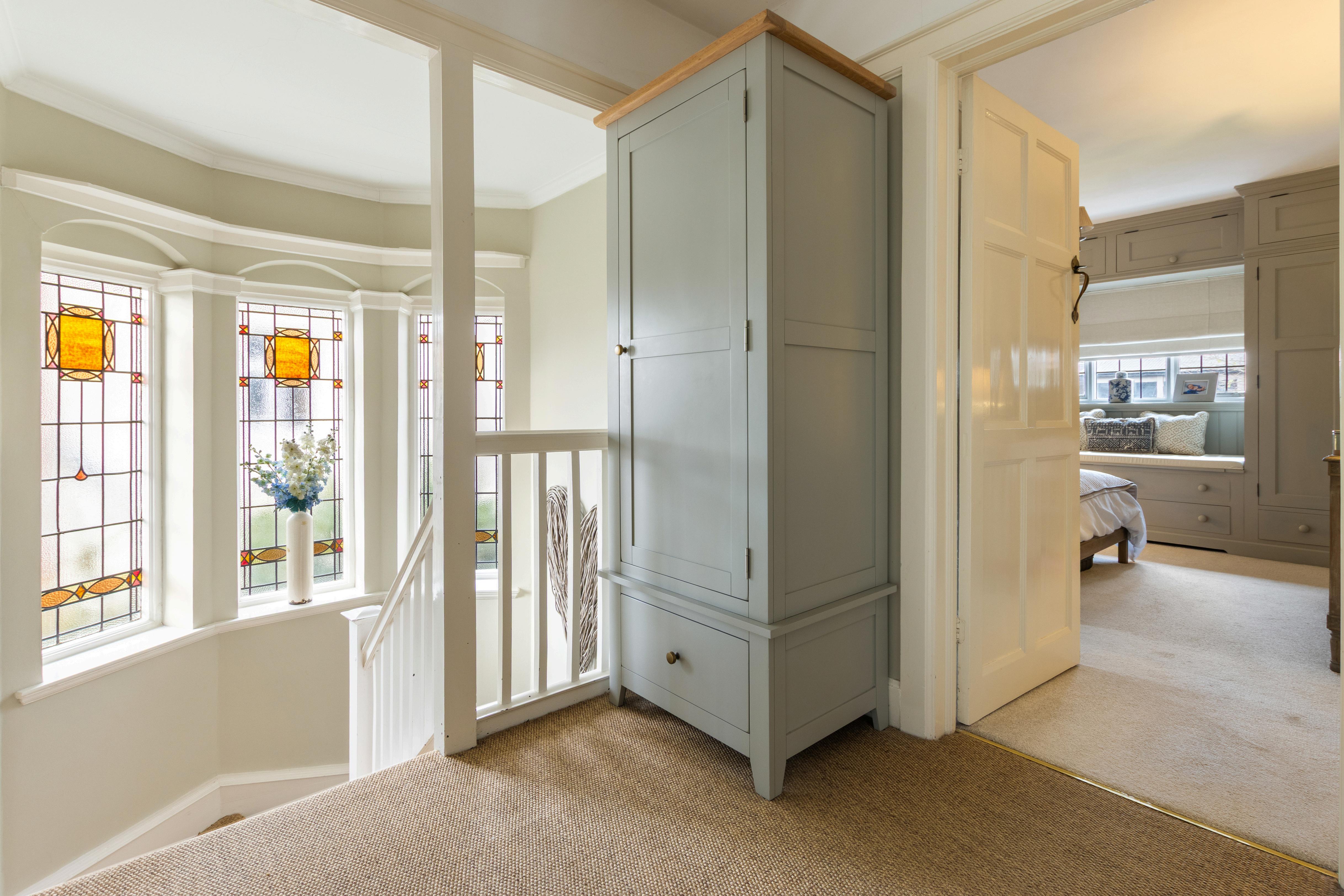 First Floor Upstairs, the property continues to impress with three generously proportioned bedrooms, each enhanced by bespoke built-in wardrobes and cupboards that maximise space and functionality. A beautifully appointed family bathroom serves the floor, and the landing is graced by a striking feature window that adds architectural interest and a nod to the property's heritage. The layout offers comfort and versatility, making it ideal for families, professionals, or anyone seeking a refined living environment.