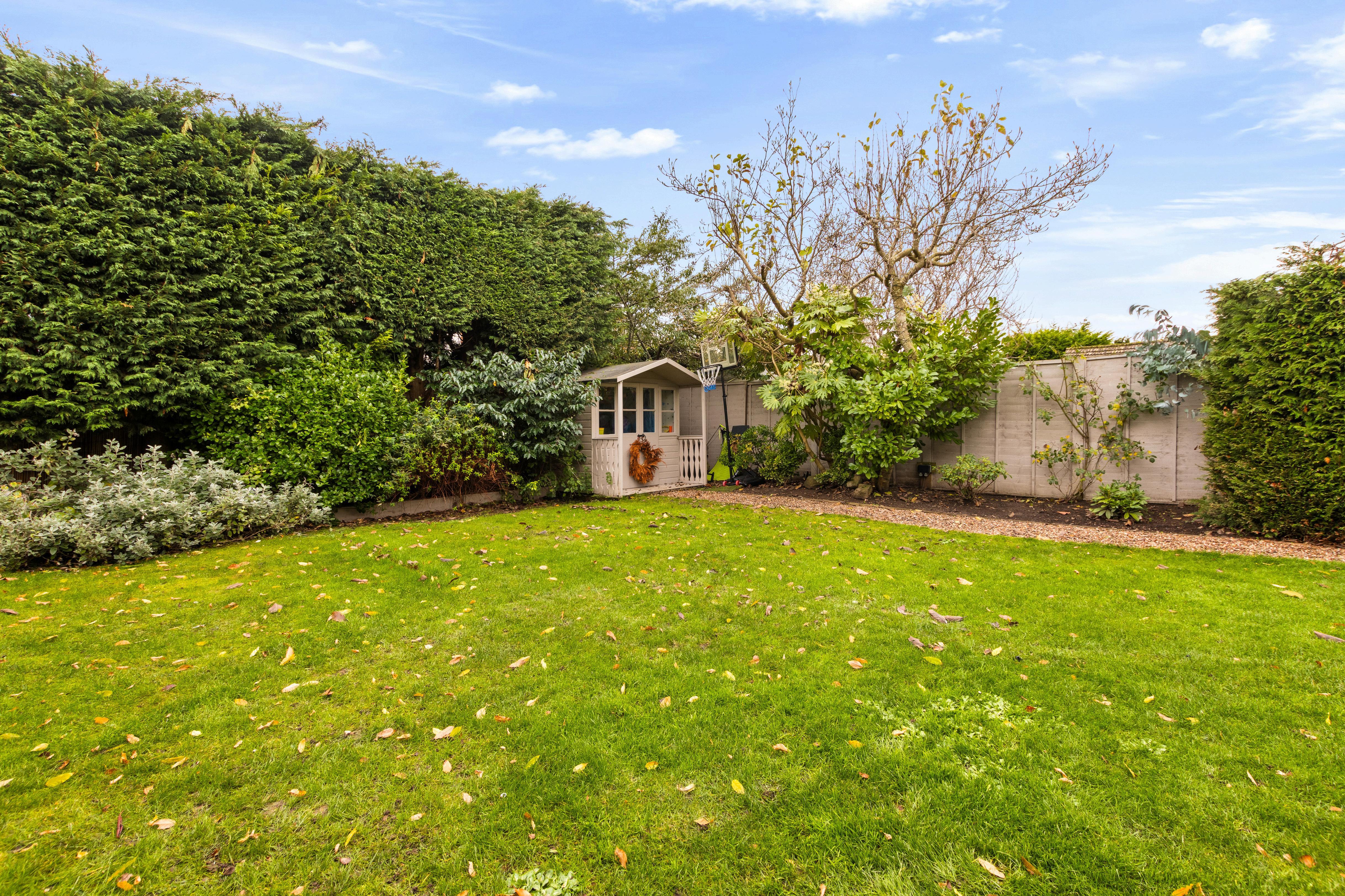 The rear garden is a private haven, thoughtfully landscaped to accommodate both leisure and play. A paved patio area is perfect for outdoor dining, while the lawn and dedicated play zone offer space for children and relaxation. The exterior blends classic brickwork with modern additions such as skylights and large glass doors, creating a harmonious and inviting façade. A driveway provides convenient off-road parking, and the overall setting is peaceful and well-maintained.