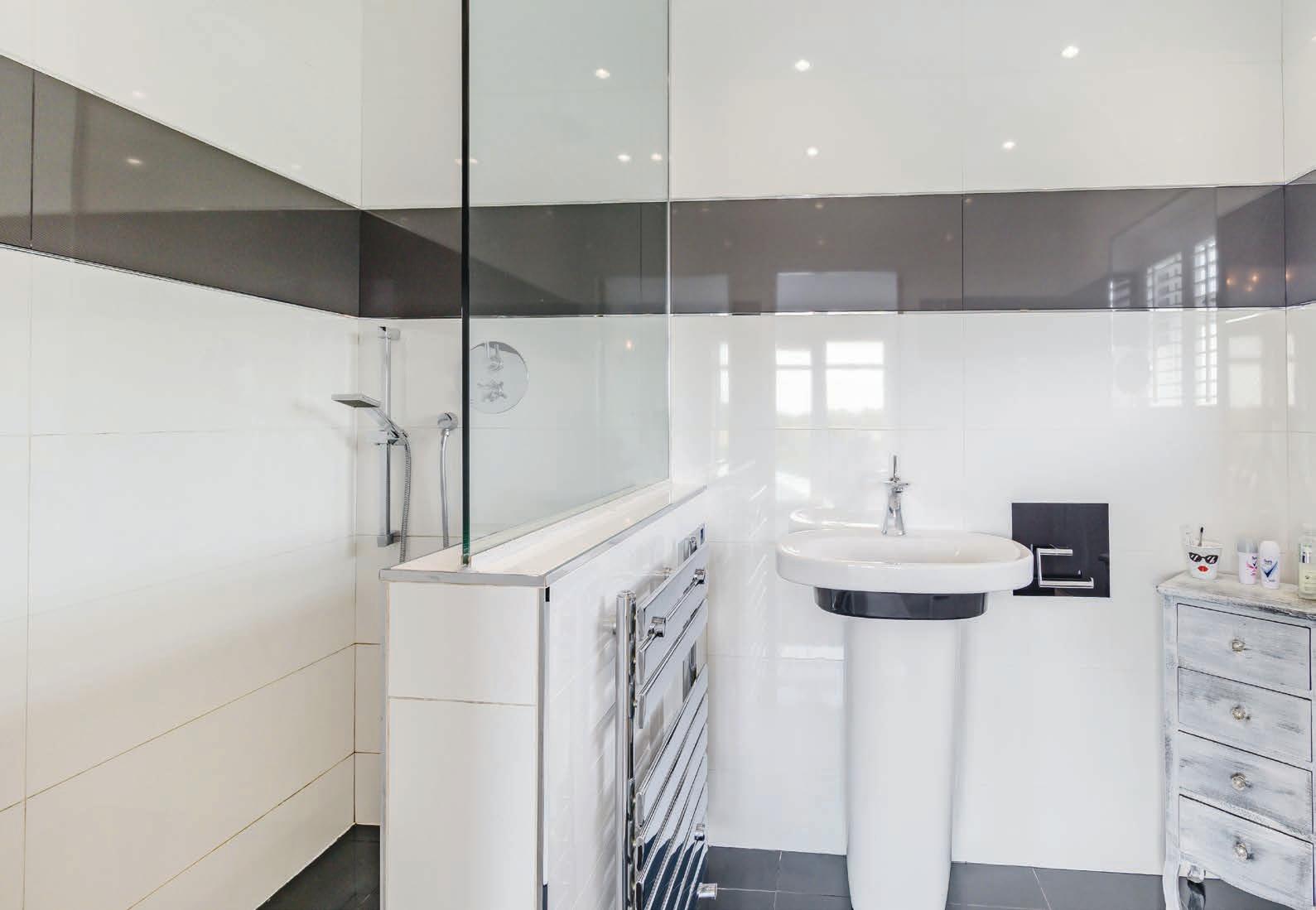 The family bathroom is presented with a modern suite, has a walk-in, wet room style shower with a fixed glass screen, a double ended bath, a low flush W.C and wall hung, twin wash hand basins with mirrors behind, the room benefits from tiling to the walls and floor, has a contemporary style heated towel radiator and a frosted window with plantation style shutters.