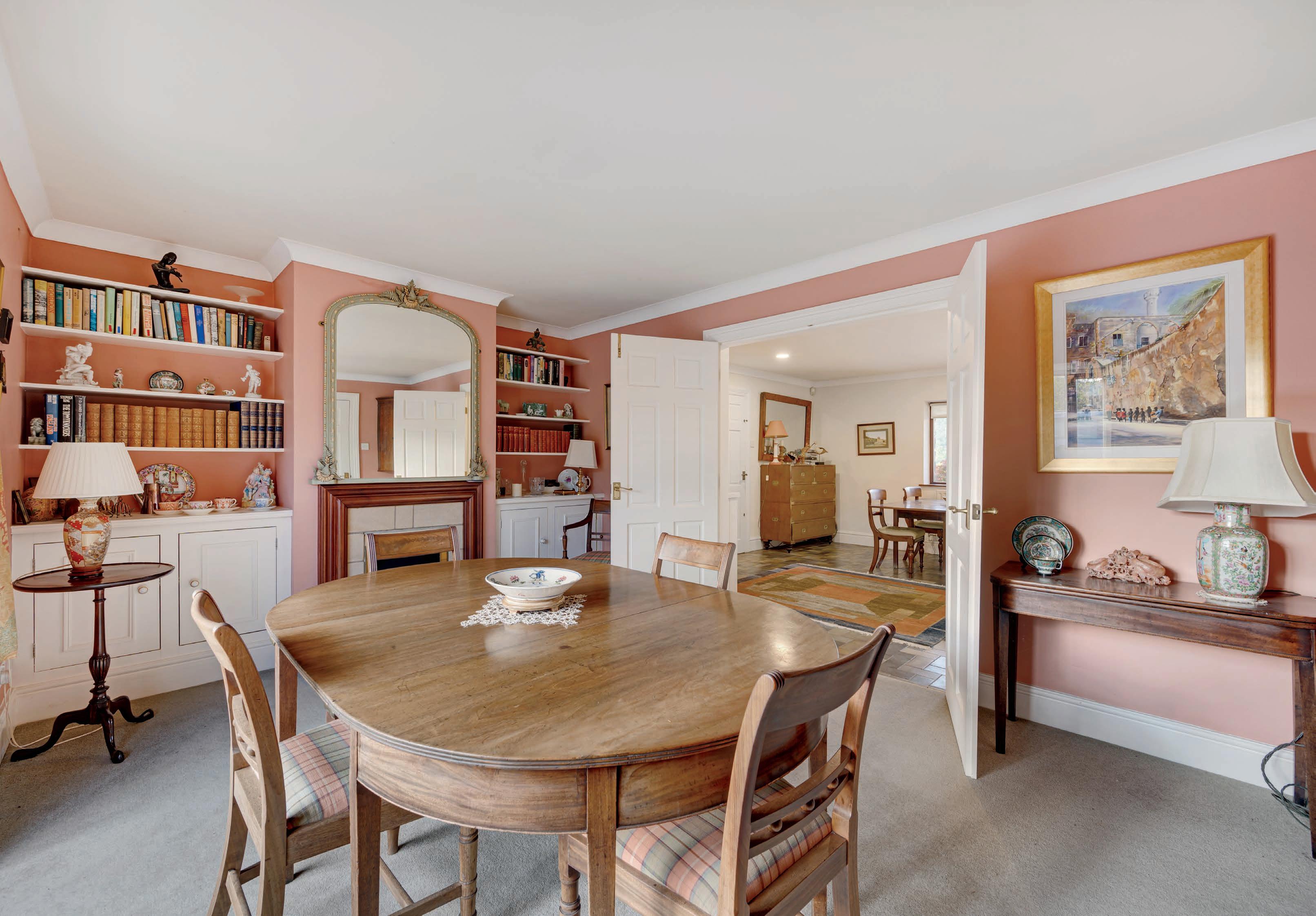 The accommodation comprises: A generous L-shaped entrance hall featuring built-in storage, an external door to the front, and a cosy seating area with sliding patio doors that open to the garden. The hallway also includes a convenient 2pc cloakroom. The elegant dining room is adorned with a living flame gas fire, built-in storage cupboard and shelving, a bay window, and double doors leading to the dining kitchen. The kitchen is well-appointed with a range of base and eye-level units, an electric hob, a double oven, space for a tall fridge freezer, an integrated dishwasher, Quartz work surfaces with matching upstands, and an island unit, all set upon a tiled floor. The living room is a perfect blend of comfort and style, featuring a living flame gas fire framed by a stunning limestone fireplace, two rear-facing windows, and French doors leading to the patio area. Off the kitchen, a rear hall with a tiled floor leads to the exterior, built-in storage, and an internal door to the integral garage. Additional conveniences include another WC, and a utility room equipped with plumbing for a washing machine, space for a dryer, a floor-mounted Worcester central heating boiler, and ample work surface space. The property offers four generously sized bedrooms, all benefiting from built-in wardrobes. The primary bedroom boasts a stylish 3pc en-suite shower room, complete with a shower cubicle with a rainfall showerhead, a vanity wash basin, a dual flush WC, tiled floors and walls, a fitted mirror, and a toiletries cupboard. The main house bathroom features a 3pc suite, including a panelled bath with an overhead direct feed shower, a vanity wash basin, a dual flush WC, built-in storage, and access to the roof void.