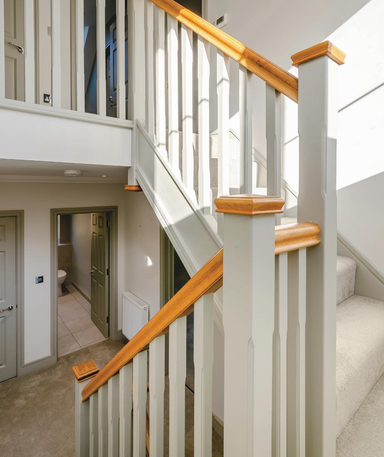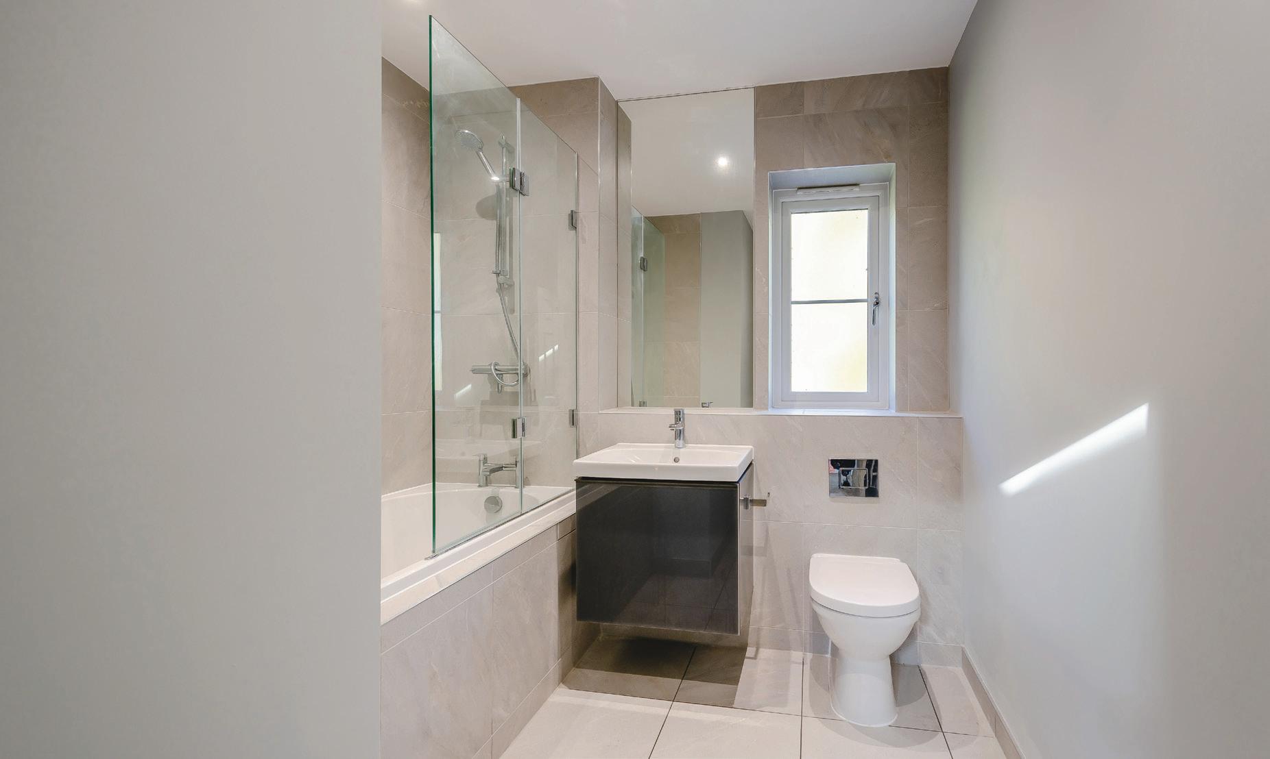 The first-floor landing, illuminated by a large south-facing window, leads to three bedrooms and a family bathroom. The principal suite features two built-in double wardrobes and a luxurious en-suite bathroom with a bath, walk-in shower, vanity unit and WC. Two additional bedrooms enjoy views of the surrounding parklands and green spaces. The family bathroom is beautifully finished with natural stone tiles and includes a bath with an overhead shower. A cupboard on
