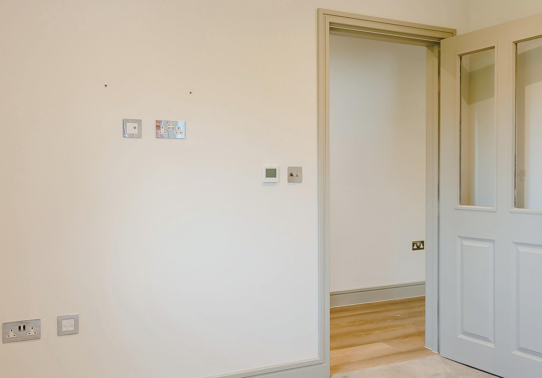 A contemporary five-bedroom home with elegant features and stunning parkland views. This thoughtfully designed property spans three floors, offering modern living spaces with luxurious finishes. The entrance hallway, finished with engineered oak flooring, provides direct views of the garden through glazed rear doors. A cloakroom with a WC, vanity unit, and metro tiling is conveniently located to the left, alongside a utility room equipped with a sink, storage, plumbing for appliances, and a cupboard housing the LPG fired Baxi-boiler.