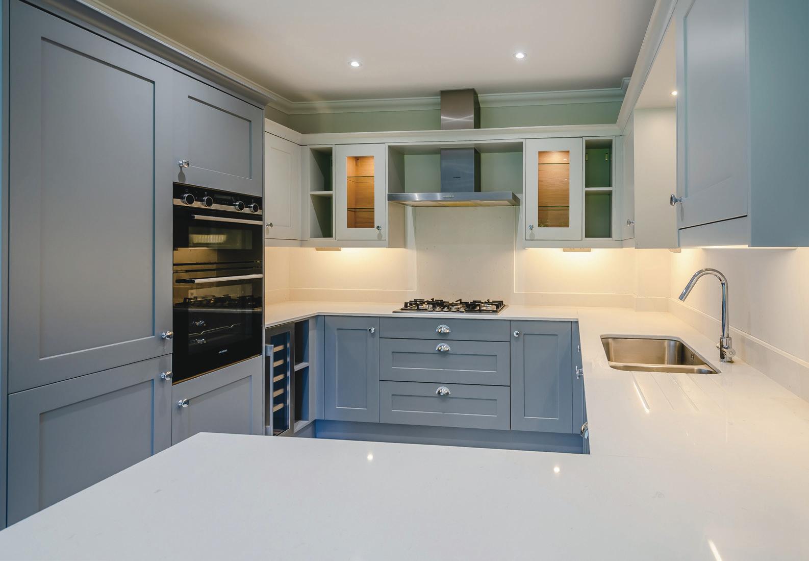 A separate study offers a flexible space for work, play, or relaxation, benefiting from large windows that flood the room with natural light. The family kitchen and dining room serve as the heart of the home, featuring quartz worktops, integrated Siemens appliances, and a mix of ivory and charcoal cabinetry. This open-plan space accommodates a dining area and a living space with French doors leading to the patio, complemented by a focal gas-fired fireplace and underfloor heating throughout the ground floor.