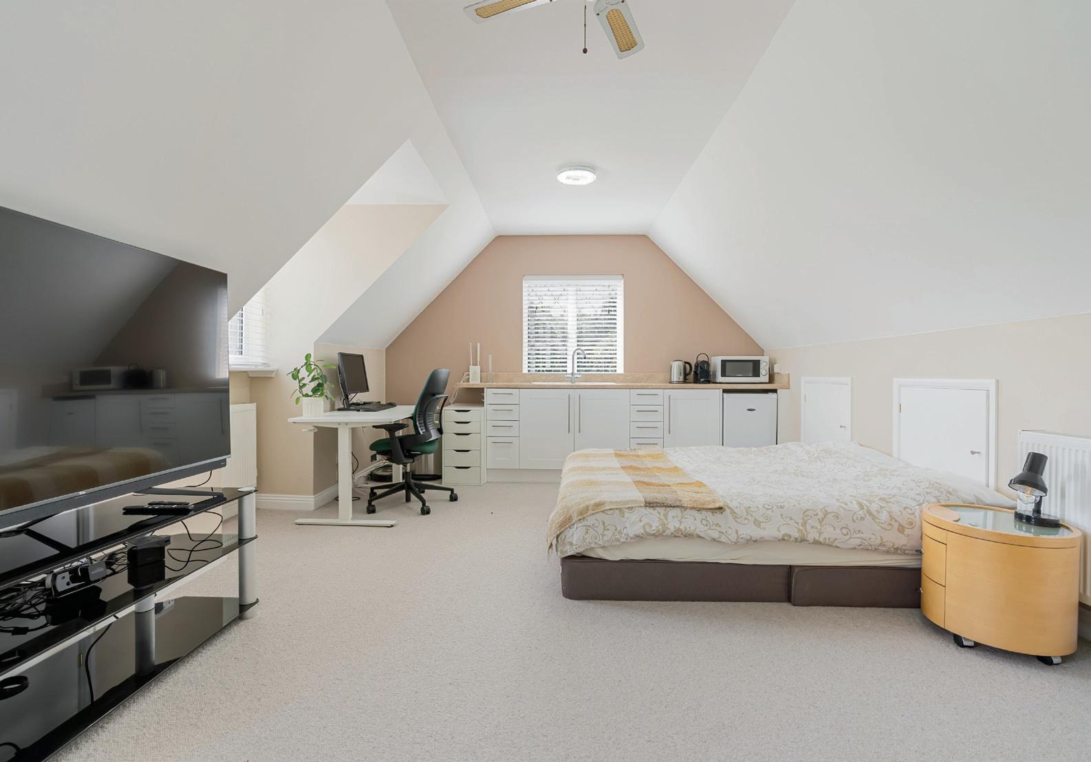 The detached double garage includes a cloakroom and an upper floor studio with kitchen, currently used as a fifth bedroom/office, presenting excellent scope for an annexe (subject to planning), perfect for home working, guests or multi-generational living.