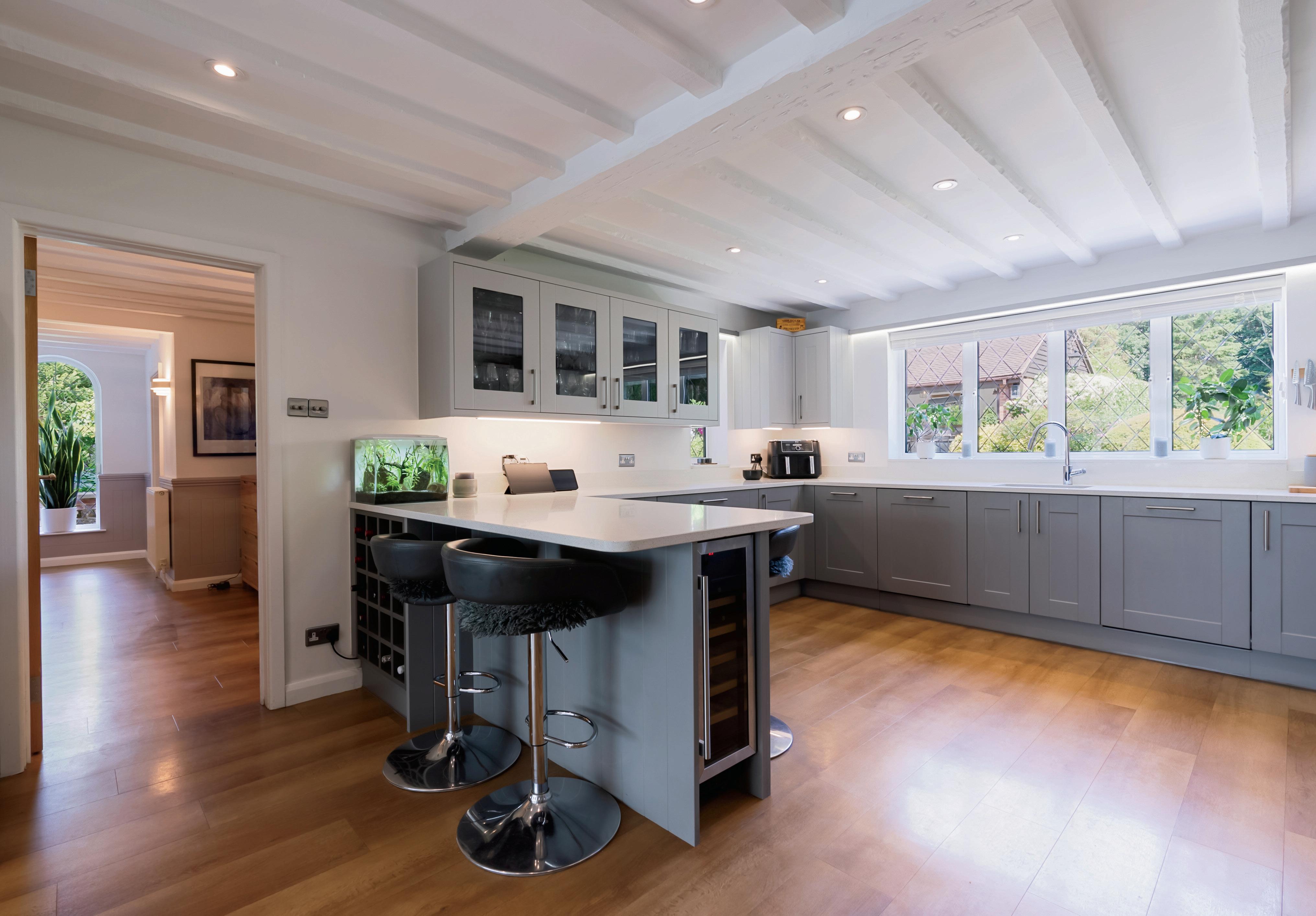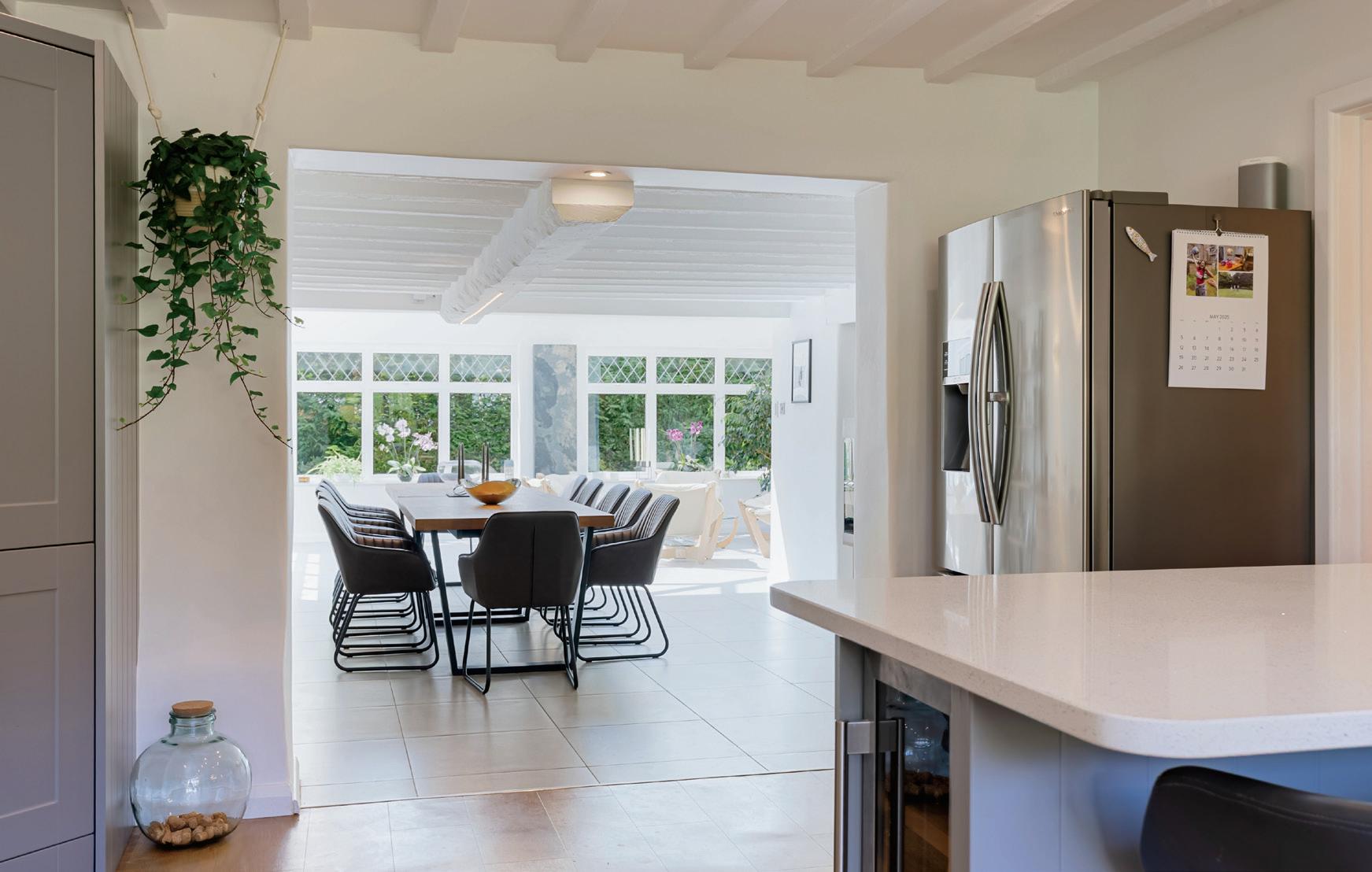 Positioned discreetly down a 100-metre tree-lined gravel drive, the property opens to reveal manicured lawns, a large courtyard-style hardstanding, and an elegant main residence that blends period charm with sleek Nordic-inspired design. Inside, the interiors reflect the owners’ love for Scandinavian simplicity and comfort – or as they call it, “Scandified”. Clean lines, subtle earthy tones, and the clever use of natural light bring an effortless harmony to each room. Original beams, now painted white, provide a nod to the home’s character while creating a brighter, more modern feel. The centrepiece of the home is undoubtedly the spacious, open-plan kitchen, dining area, and conservatory – a contemporary extension that has transformed the property and created a perfect space for both intimate family life and vibrant entertaining.